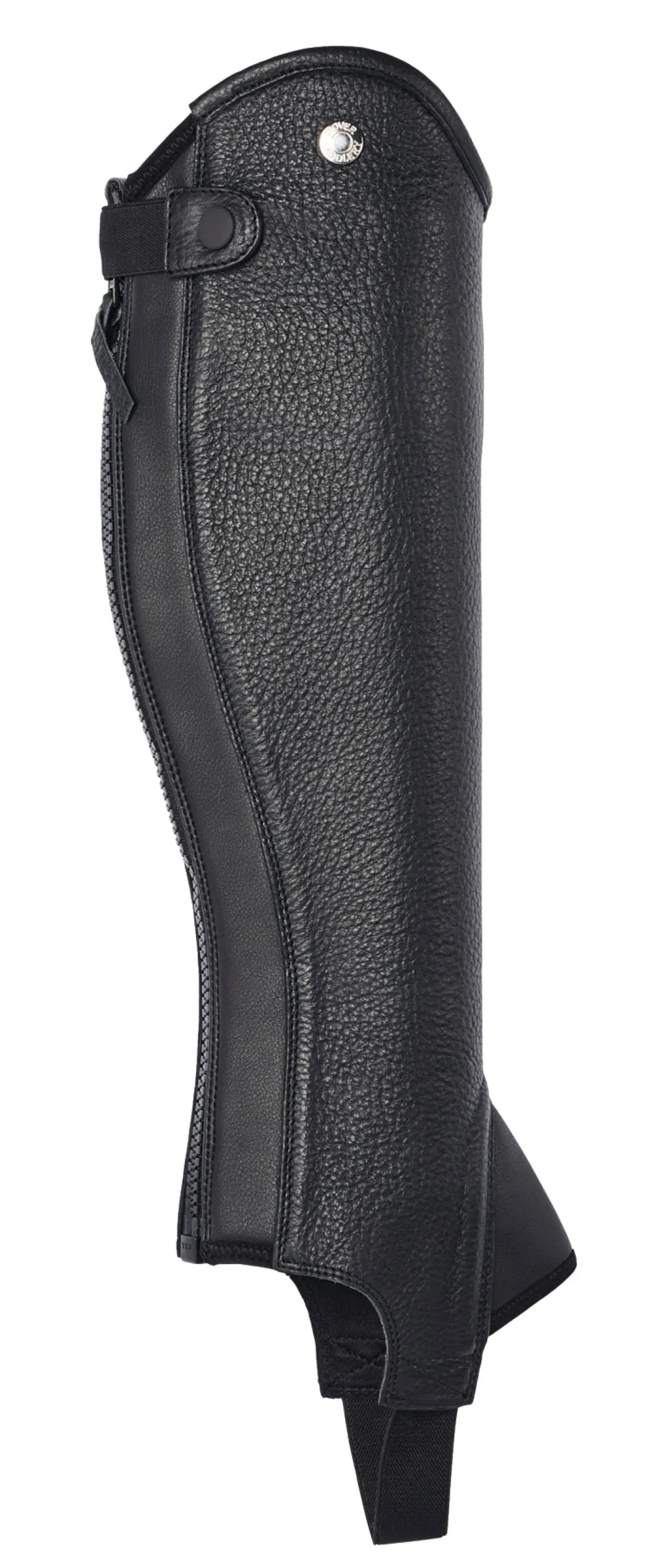 Lined in breathable and stretchy cotton fabric, it boasts a reinforced zipper that closes from bottom to top and secures with a snap keeper. Interior Equestrian Grip Strip™ is a horizontal stripe of silicone grip that prevents the half chap from twisting and sliding. Finished with a wide under-foot elastic strap.