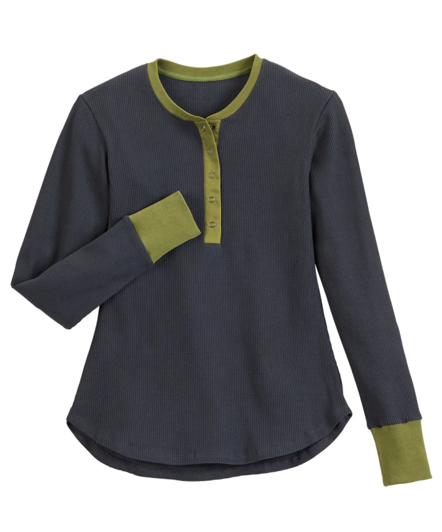 - Soft, waffle-knit Henley.