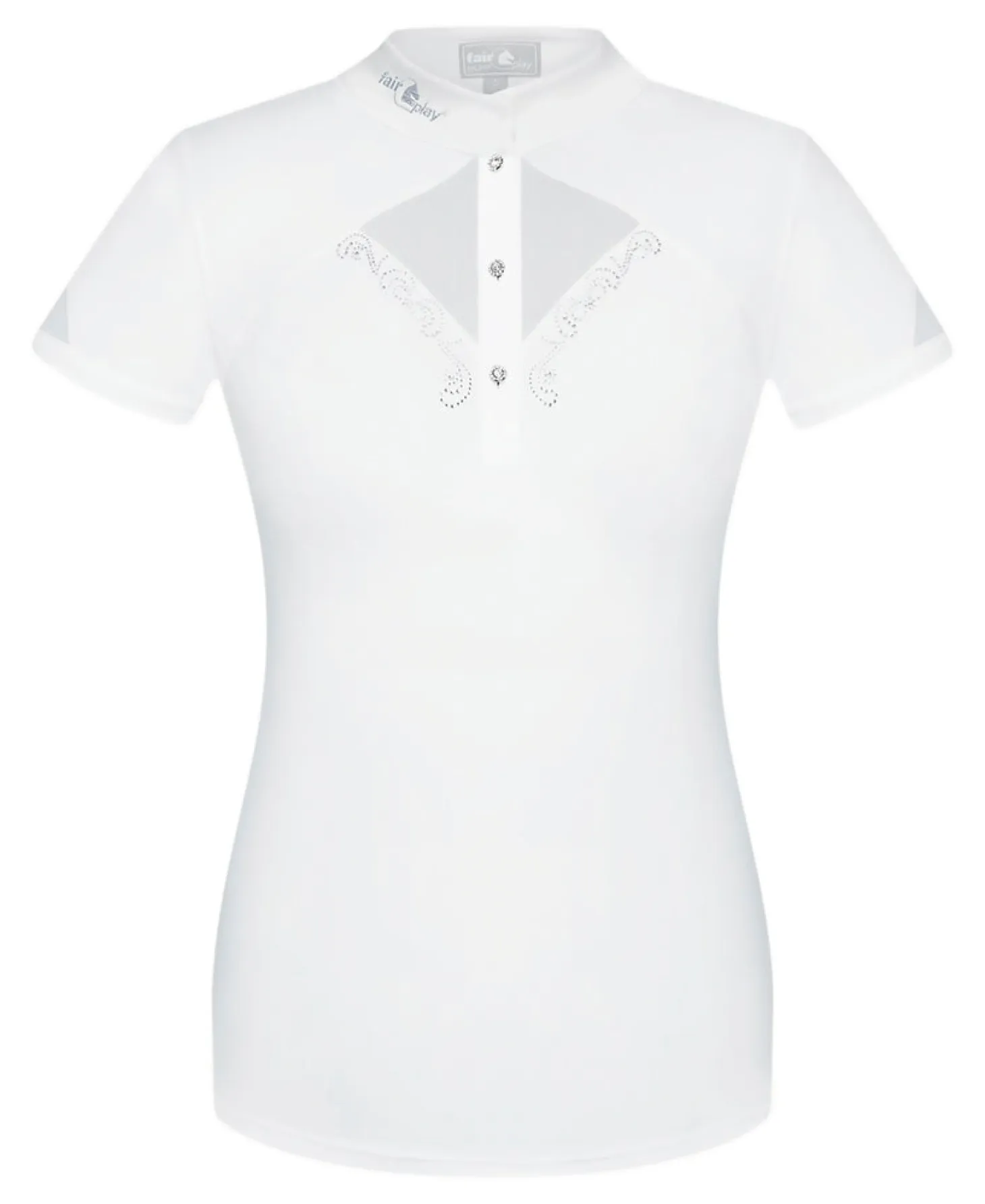 The Fair Play® Cathrine Short Sleeve Show Shirt offers an exceptionally elegant and feminine look. Made for comfort in elastic, breathable fabric, the body of the top offers UV protection. Stretch mesh inserts on the front, back and sleeves provides enhanced air circulation.