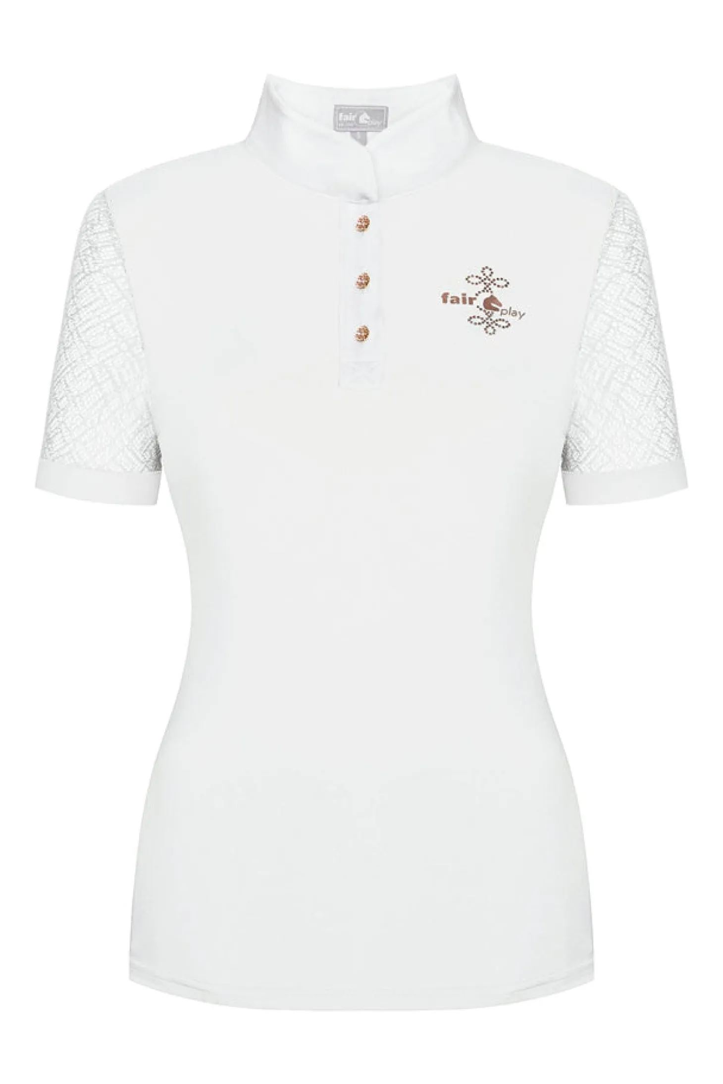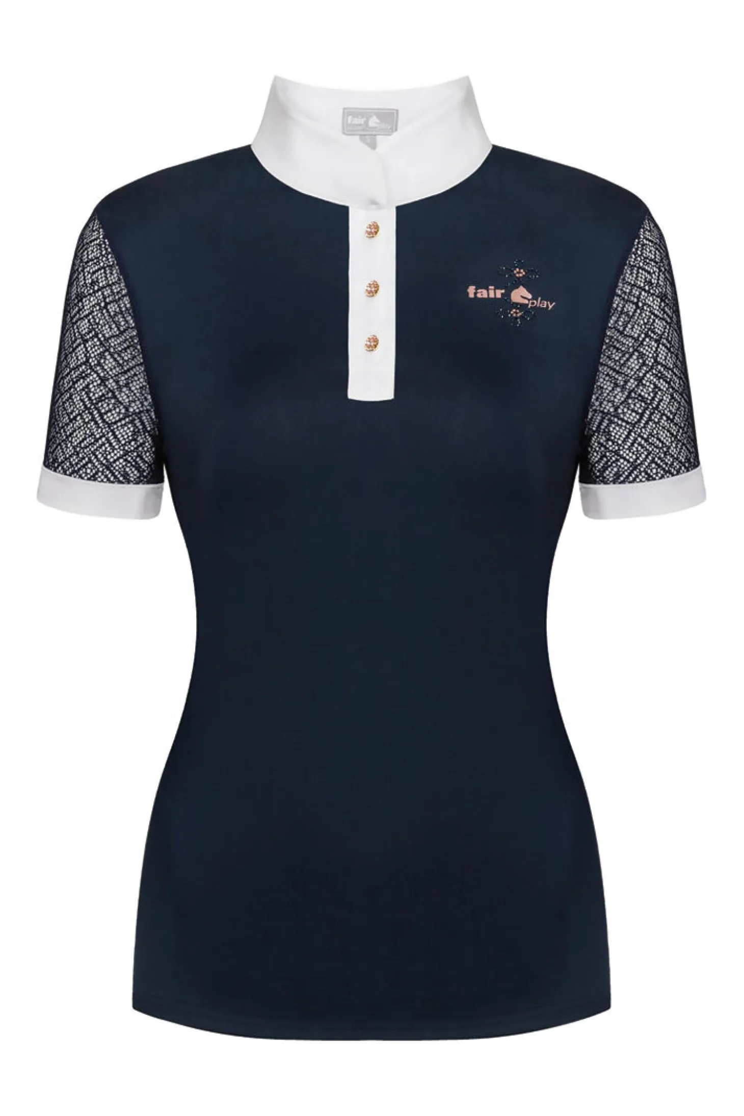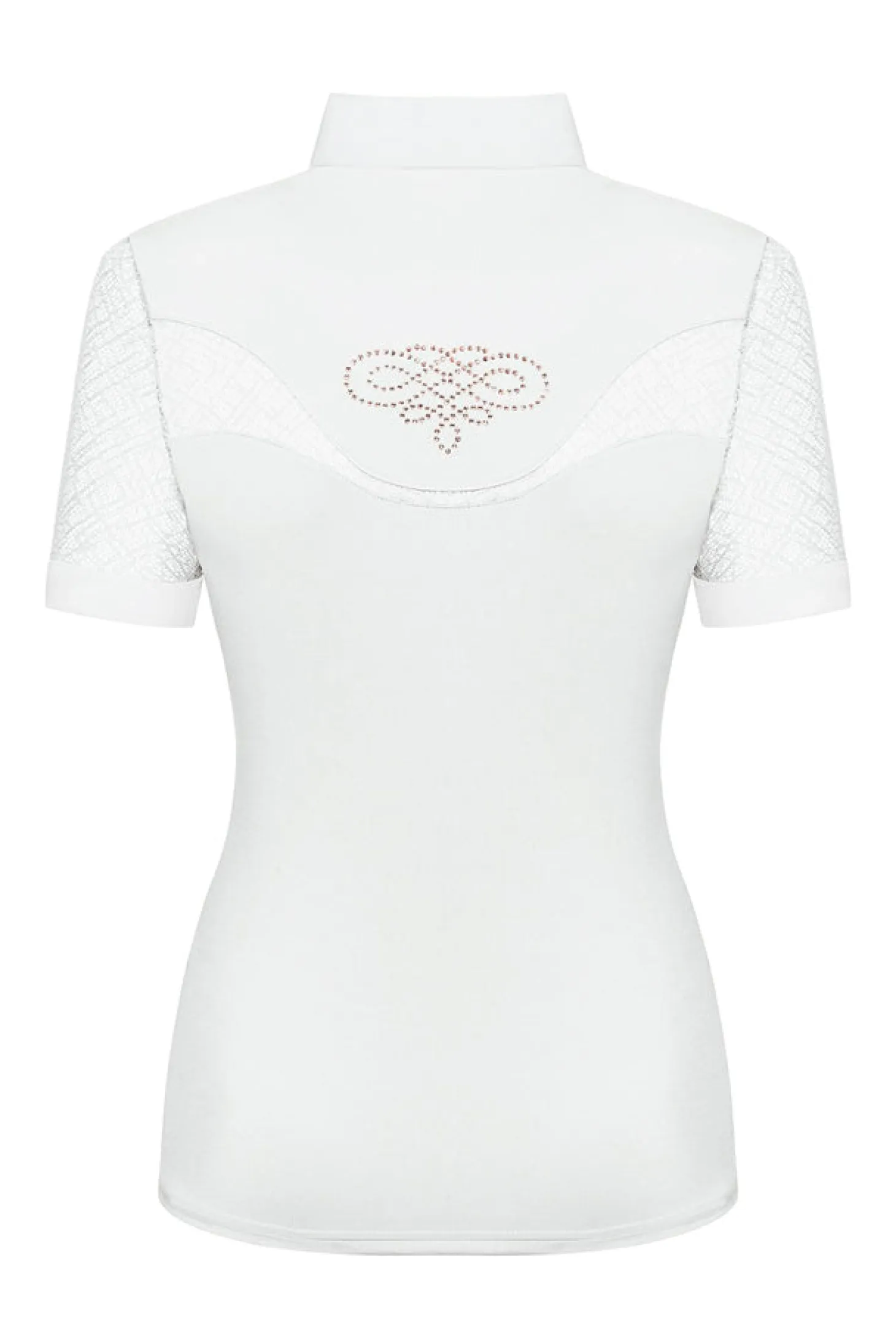 Add the Fair Play® Cecile RoseGold Short Sleeve Show Shirt to your competition outfit for chic and feminine style. Moisture-wicking, breathable and elastic fabric delivers all-day comfort. Lace inserts allow increased airflow. Decorative crystal application adorns the front and back.