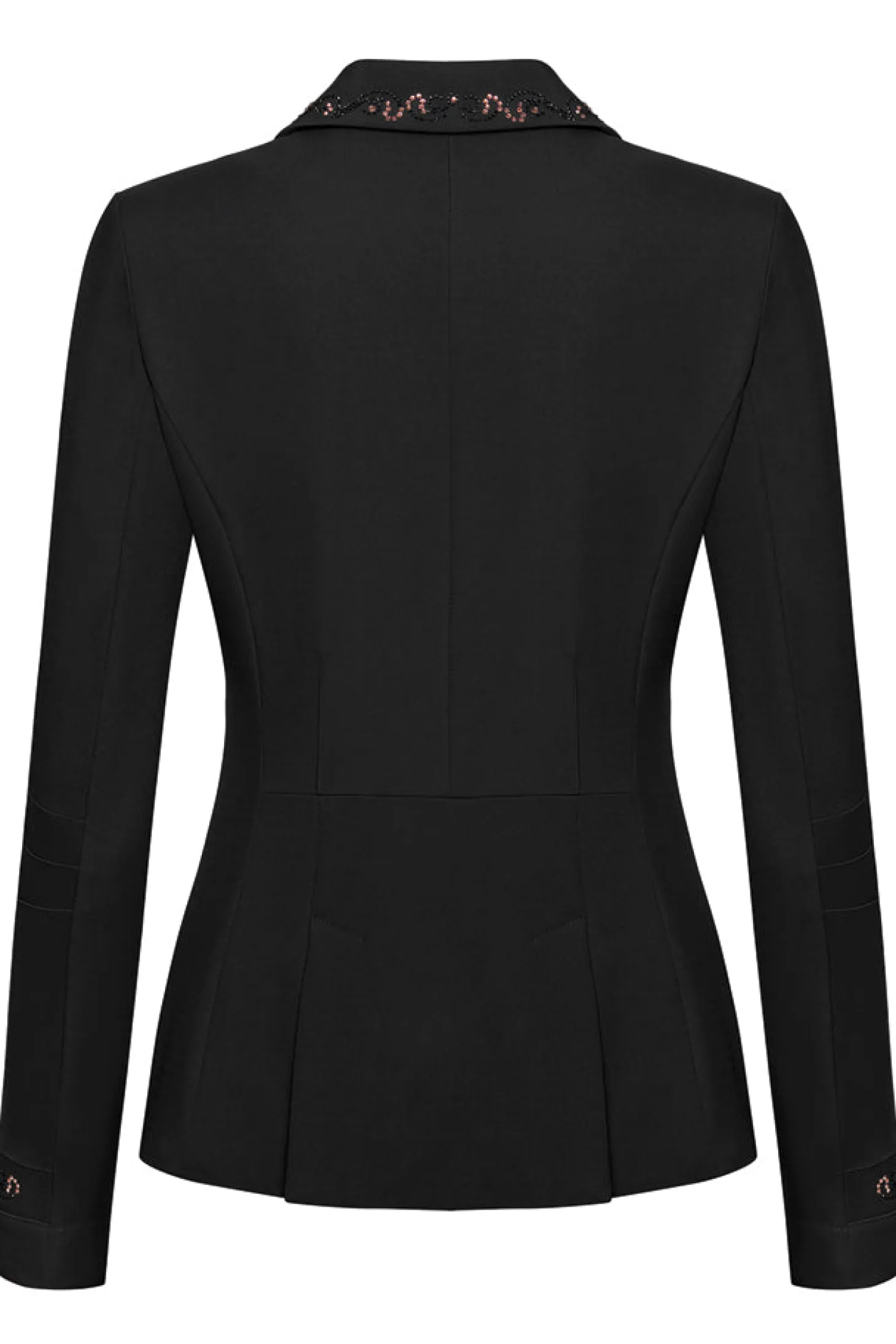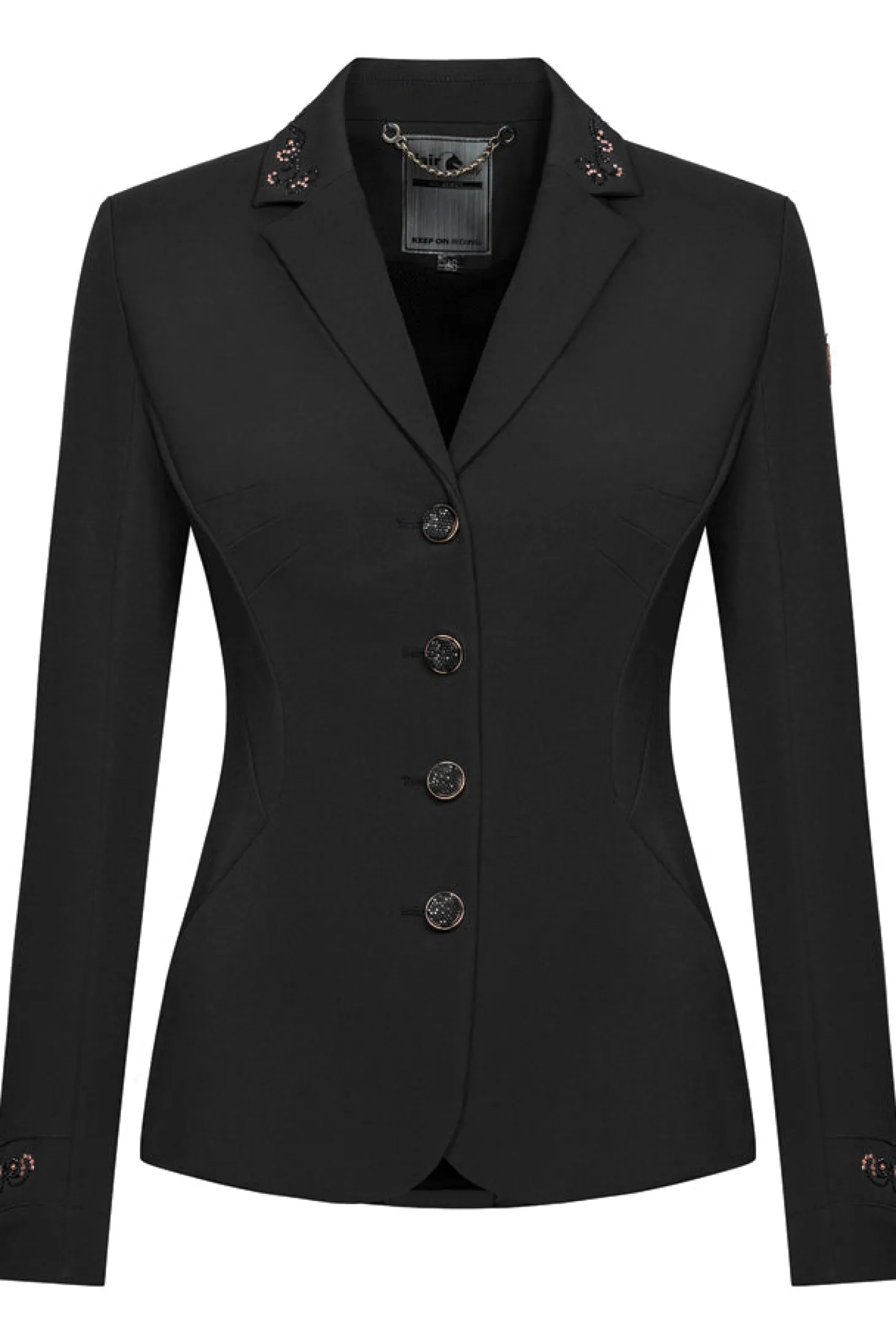 The Taylor Chic Show Coat is crafted in Poland and lined with a highly breathable mesh. Discreet eyelets under the armpits let heat escape, while rose gold and tonal crystals accent the collar and cuffs.