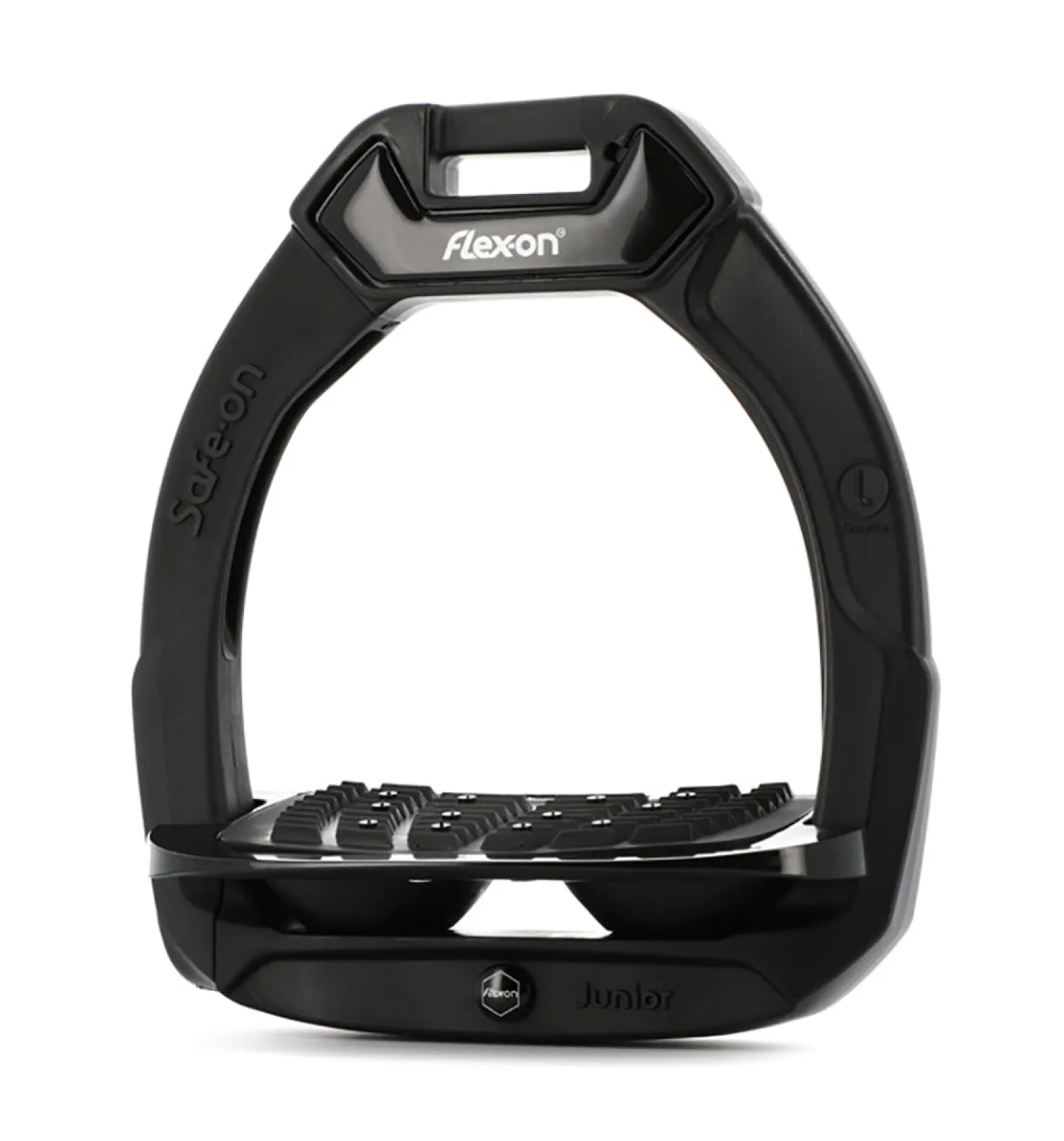 Suitable for riders weighing up to 40 kgs (approximately 88 pounds), Flex-On® Junior Safe-On Inclined Ultra Grip Stirrups are made of the environmentally friendly composite material over a spring steel frame. They feature a flexible outer branch designed to release the young rider’s foot in the event of a fall as the rider’s weight acts against it.