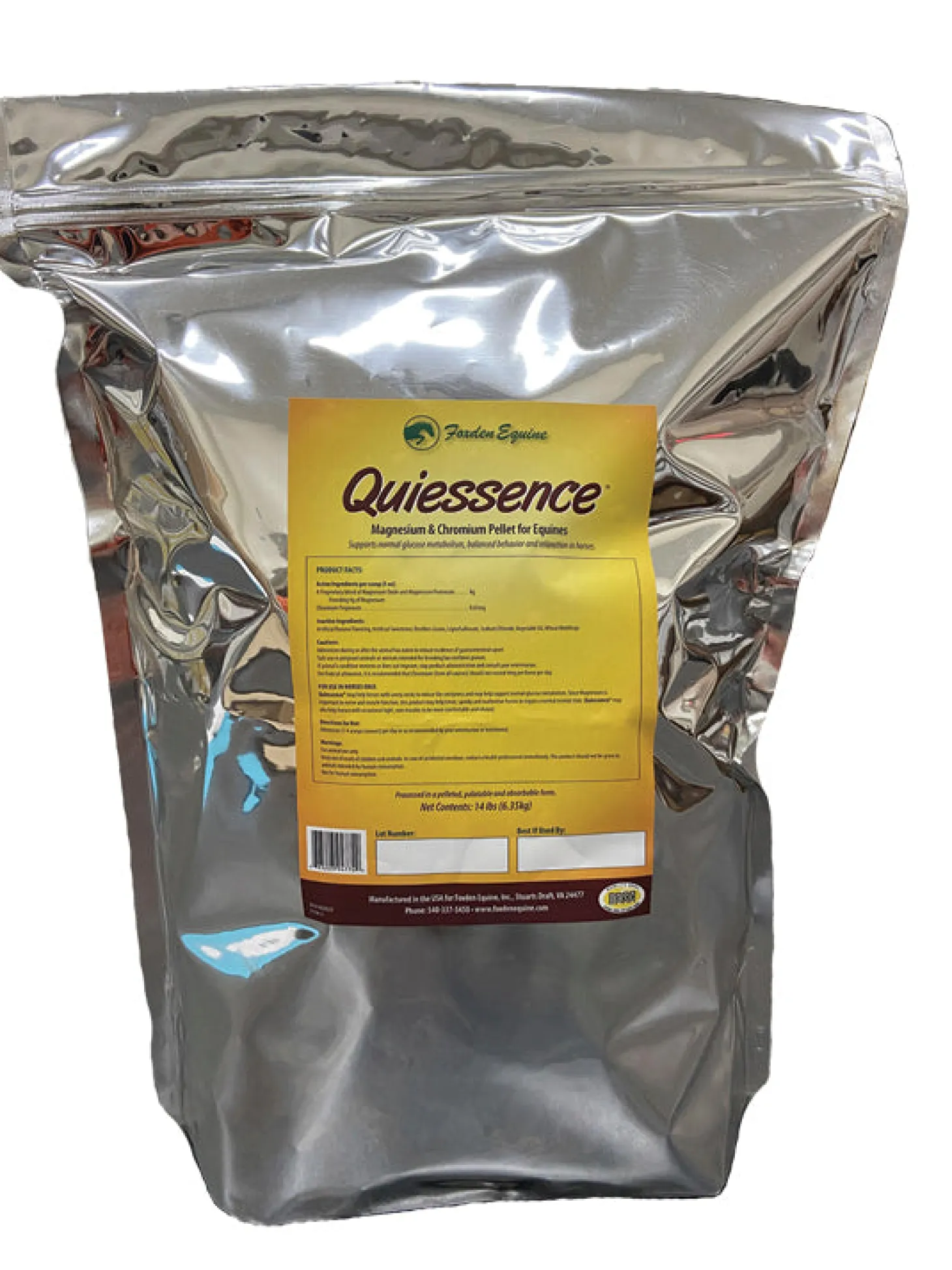 Quiessence® from Foxden Equine functions as both a horse calming and digestive supplement. This magnesium and chromium formula is designed to support calm, balanced behavior in horses. Helps nervous, tense or sore backed horses as well as cresty neck or founder-prone horses. Helps horses who have problems gaining or maintaining weight. Benefits horses grazing on acid soils or land known to be low in magnesium. 14 lbs (112-day supply).