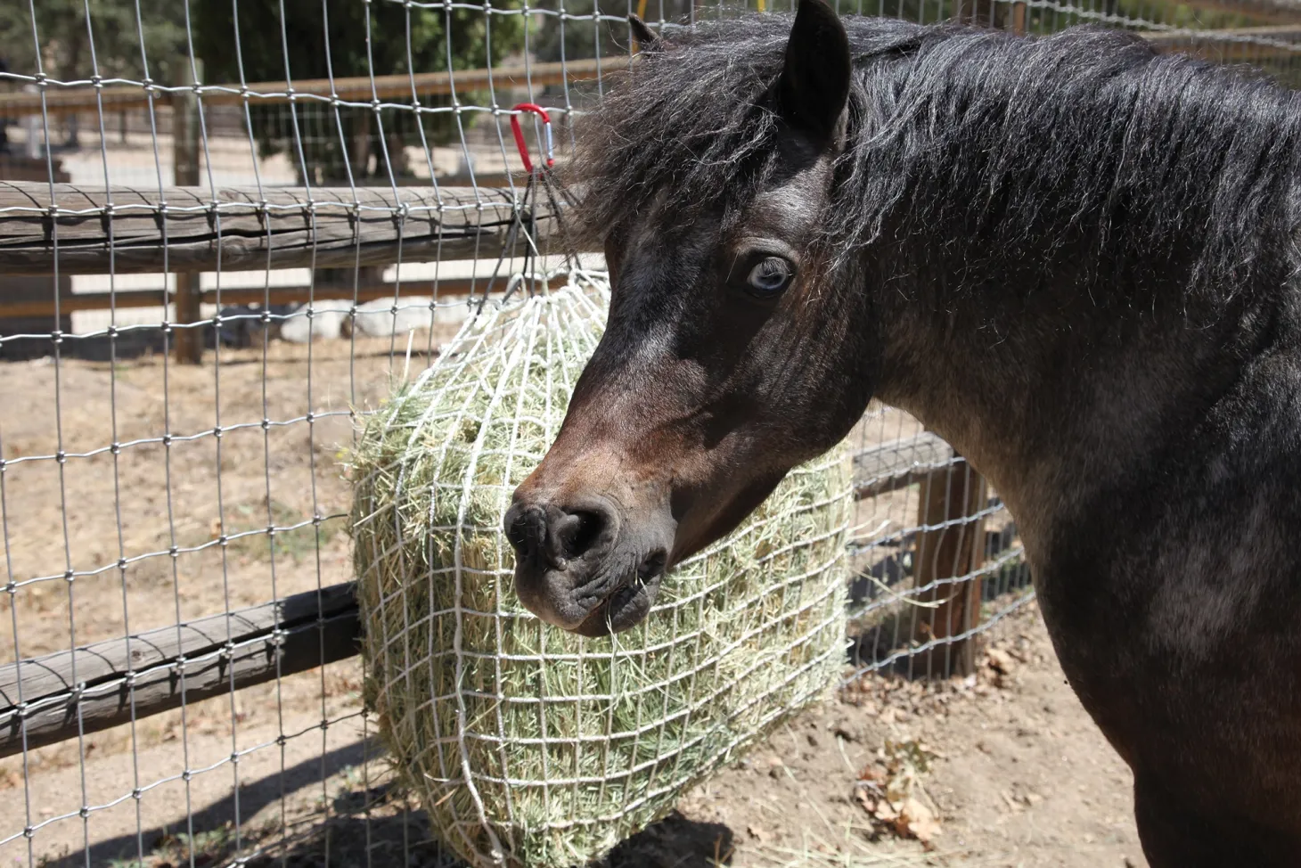 Designed and manufactured in the USA, the Freedom Feeder® Mini/Trailer Size with breakaway connection makes your horse’s hay last a long time as he feeds through the 1″ openings. This original slow feed net feeding system simulates natural foraging and optimizes your horse’s digestion. It’s made from soft, yet extremely durable, woven knotless nylon. This easy to fill feeder also reduces the amount of waste and saves you money as almost no hay is lost to trampling. Measures 2 1/2′ x 2′ and holds 2 flakes. This bag should be hung high if your horse wears shoes or is playful. Includes draw cord closure. Spares kit includes repair cord and 3″ safety clip.
