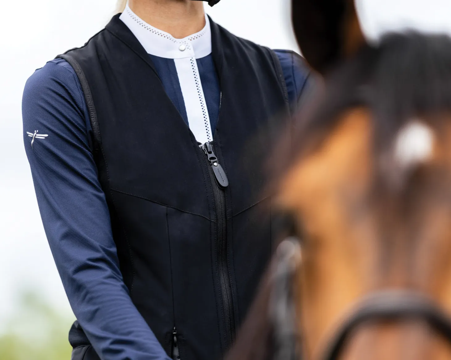 The Freejump Airbag is worn close to the body under a compatible jacket or can be worn over a thin layer of clothing, such as a T-shirt, show jacket or thin pullover. Compatible jackets bear the “Freejump Airbag Technology” badge. Each Airbag is tested individually.