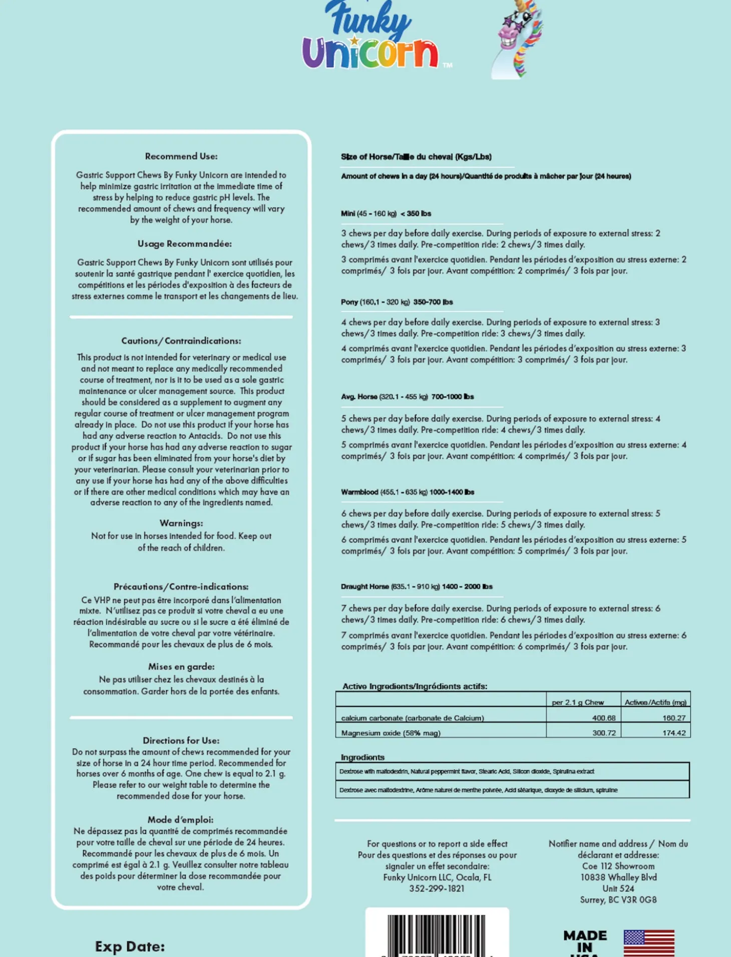Funky Unicorn Gastric Support Antacid Chews start working by neutralizing stomach acid on contact. They provide a safe, tasty, effective and convenient way to soothe your horses stomach when stress from shipping, being ridden, changing locations or an alteration in their eating habits. Gastric Support Antacid Chews were created by an FEI veterinarian for the specific purpose of helping to buffer and calm your horse’s stomach. Gastric Support Antacid Chews are to be utilized in addition to current gastric maintenance/treatment that is in place. Always confer with your veterinarian for concerns or for further recommendations.