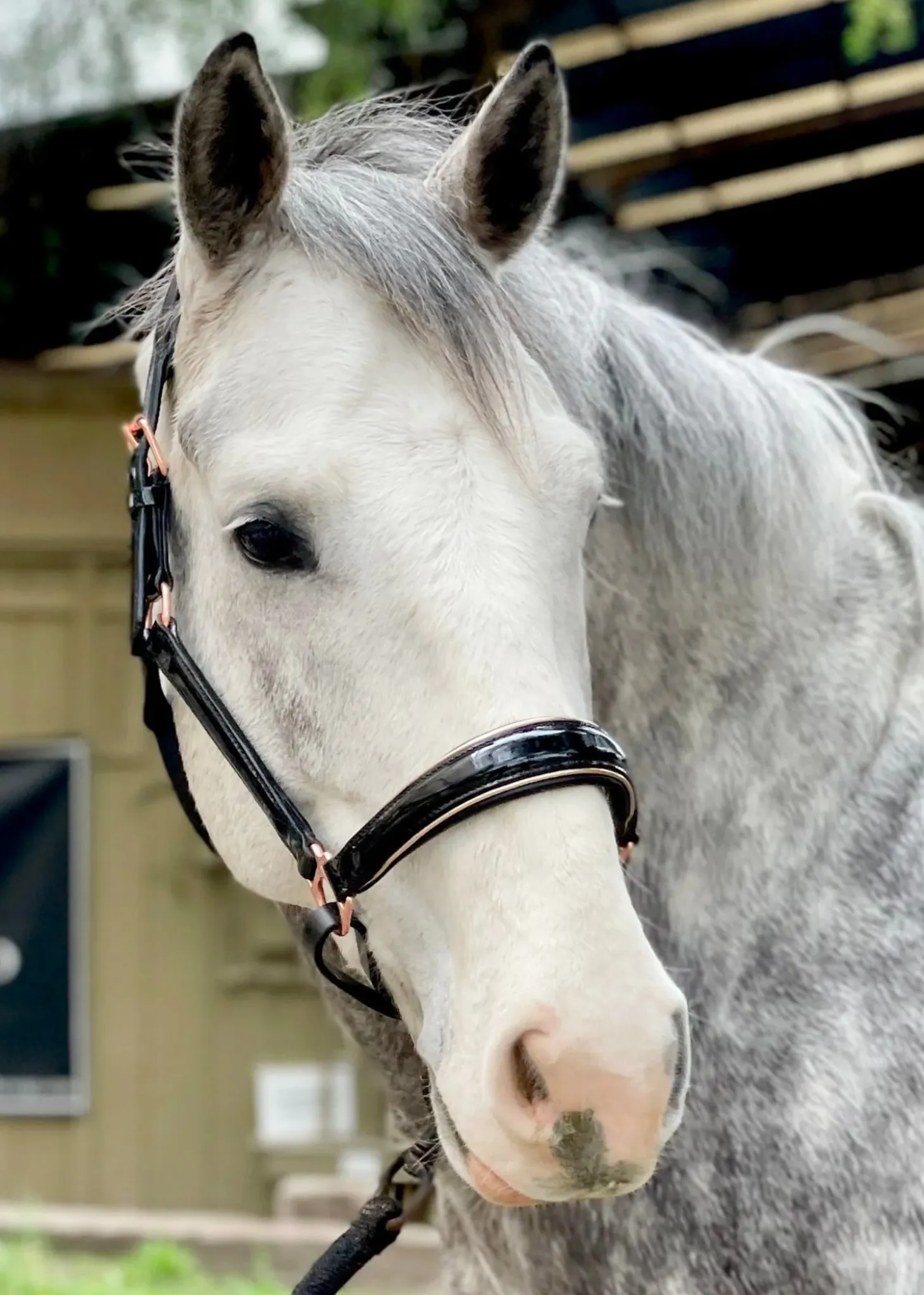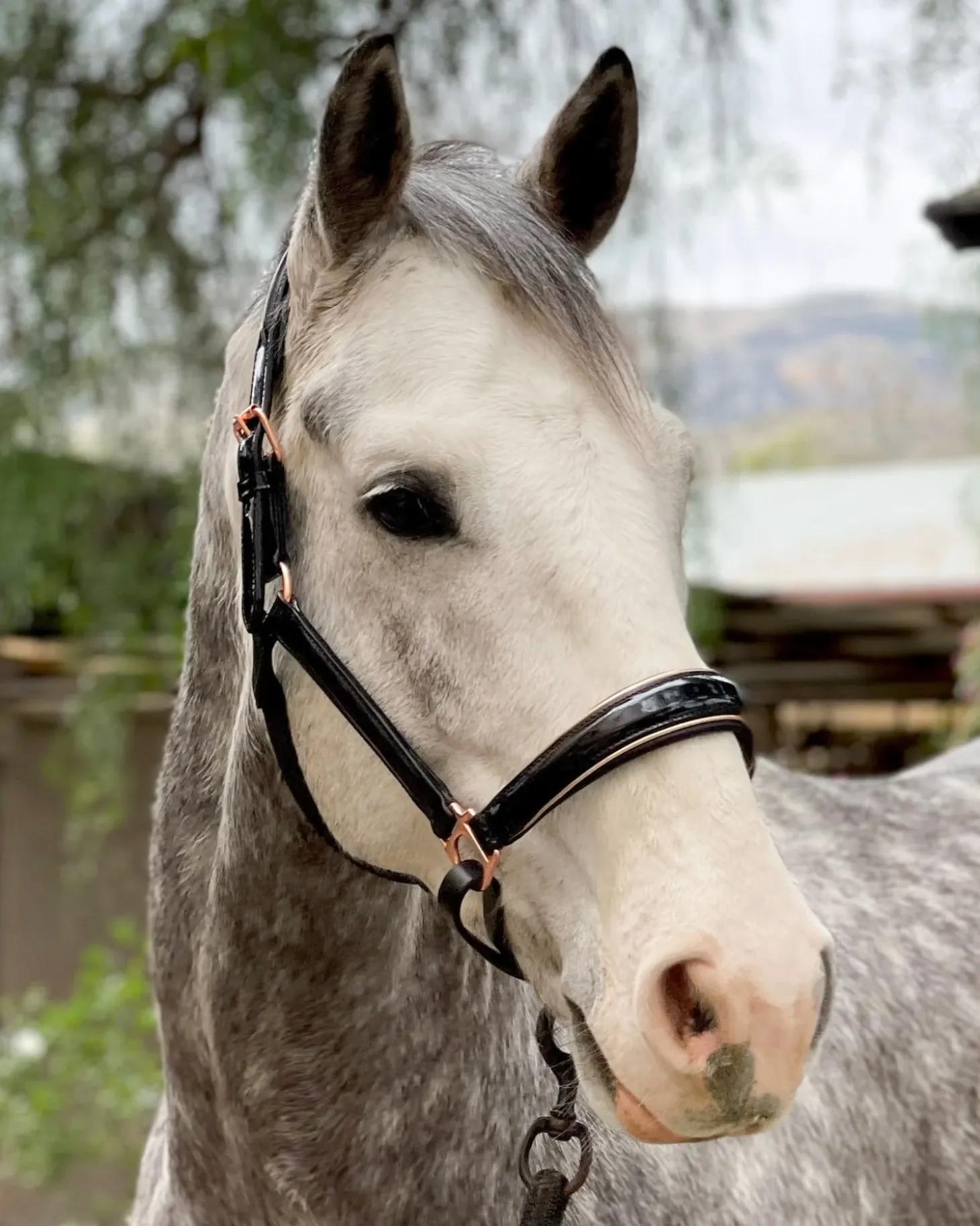 For a one of a kind, luxurious look, the Haler Ego Aurelia Rose Gold Halter will not dissapoint. The black patent leather conical noseband has ultra soft Nappa leather padding, rose gold buckles and fittings, and metallic rose gold piping set this halter apart. This halter matches perfectly with the Aurelia bridle creating a gorgeous matchy matchy set!