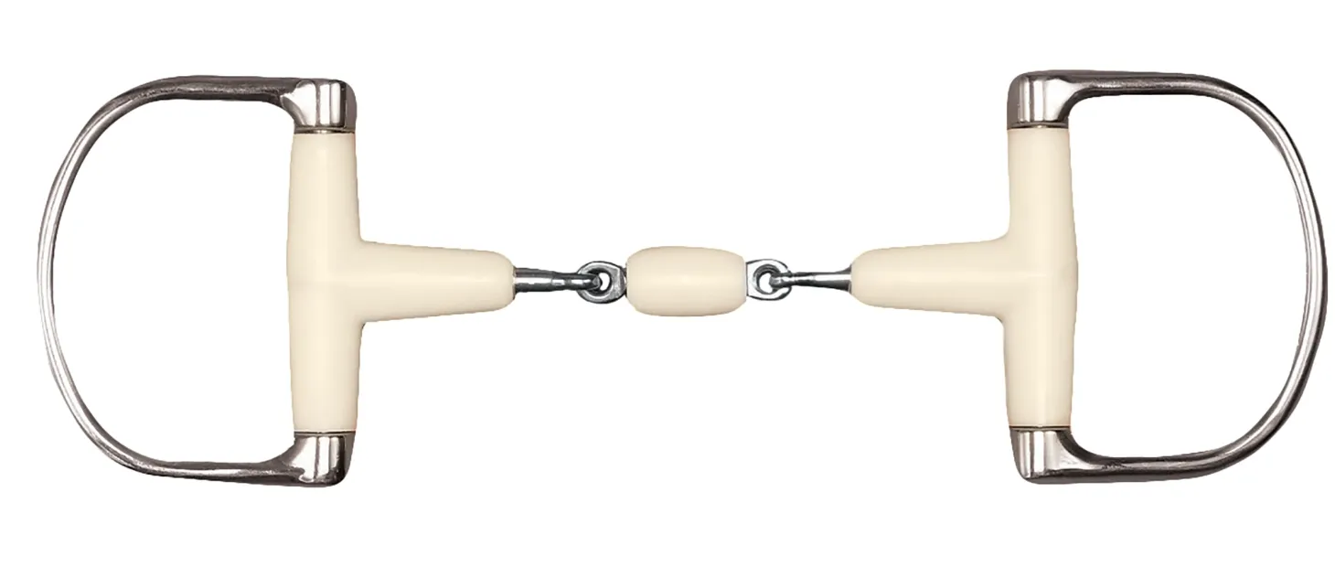 The Happy Mouth Bits® Pony Double-Jointed Racing Dee features a mouthpiece covered in soft, flexible, yet extremely durable, apple-scented plastic. This mouth material encourages bit acceptance and softness. Core and cheeks are stainless steel. Slightly smaller dee cheeks than those in a king dee, they still provide some slight lateral guidance and help prevent the bit from sliding sideways in the horse’s mouth.