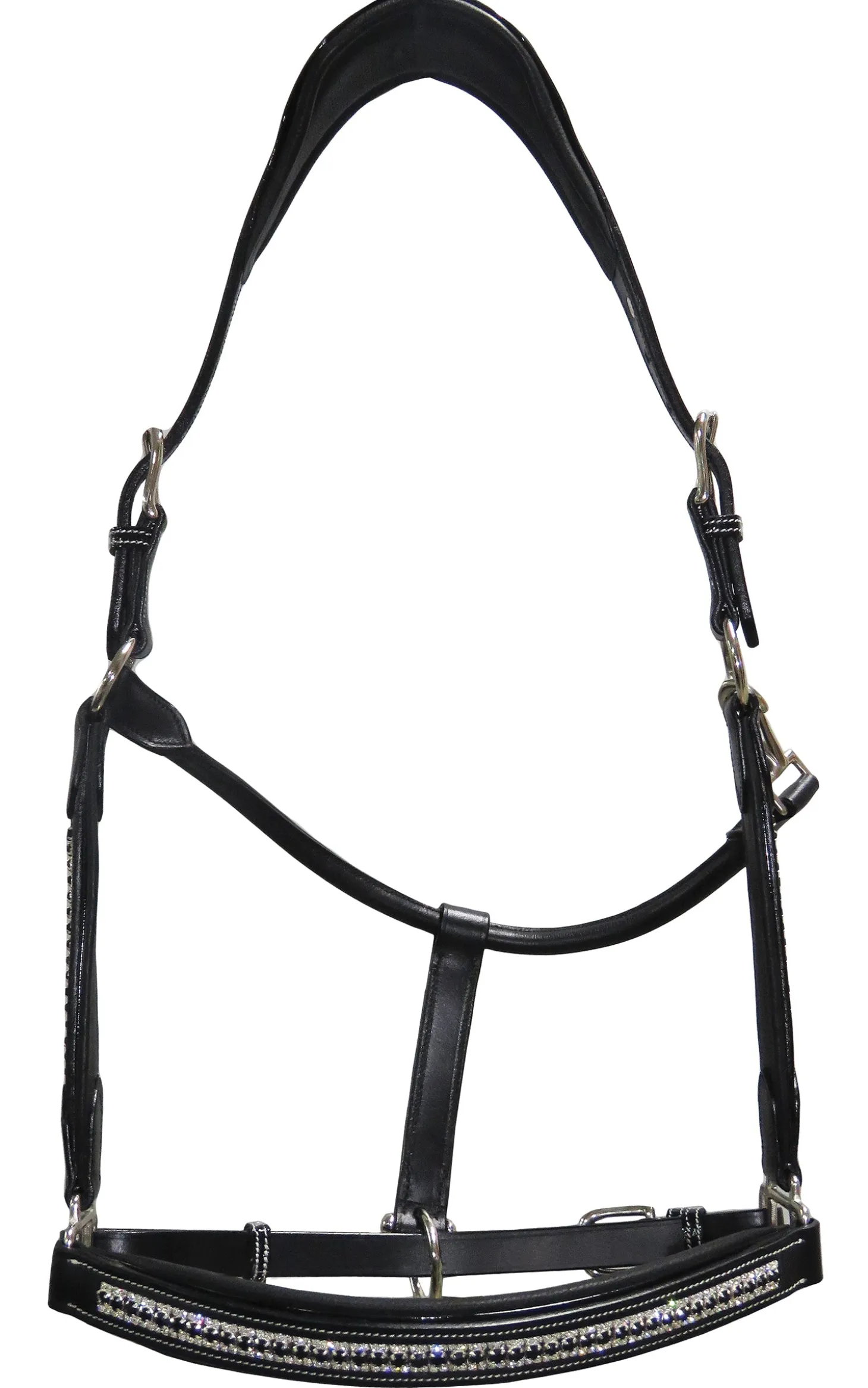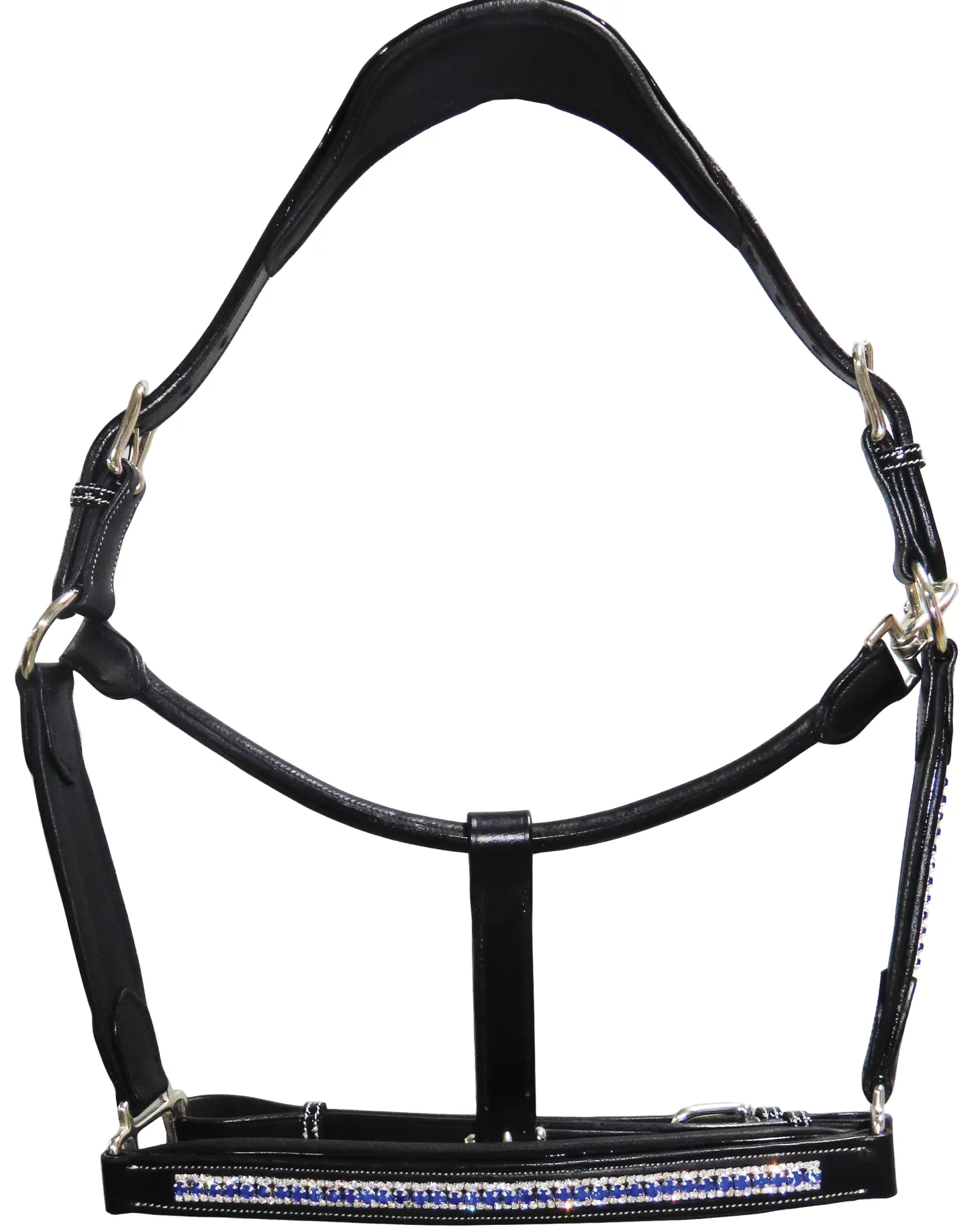The Padded Jewel Halter by Henri de Rivel shows off your sense of fashionable style. Made of soft, high-quality leather, this eye-catching halter features three rows of crystals on the nose and cheeks accented by patent leather piping. Luxuriously padded for horse comfort, it has a two-buckle crown, adjustable chin and rolled throat with snap closure. Fitted with long-wearing stainless steel hardware throughout.