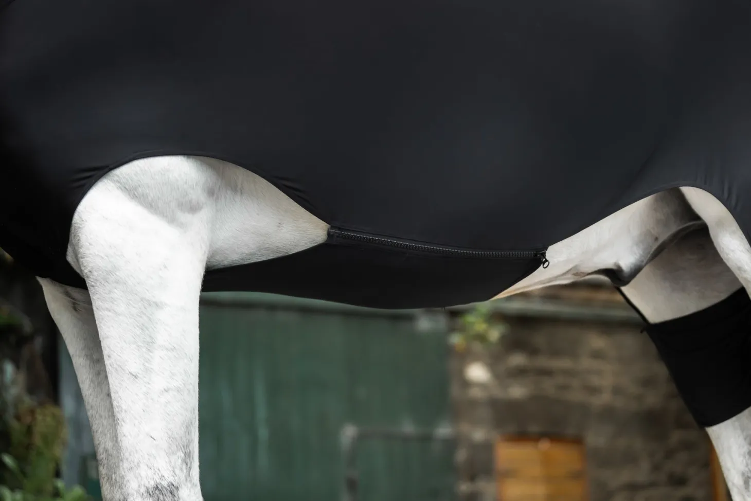 Keep your show ring shine all day long with the Horseware® Ireland Rambo® Slinky Full Body. Made from shine boosting Lycra with an anti-static treatment for a smooth and glossy coat. Contoured fit with full body coverage including face, neck, belly, hind quarters and stifle area with front and back leg arches for comfort and feedom of movement. Easy to use zip system with reinforced zip guard for face, neck, under chest and belly flap with a simple Velcro closure for the hind legs.