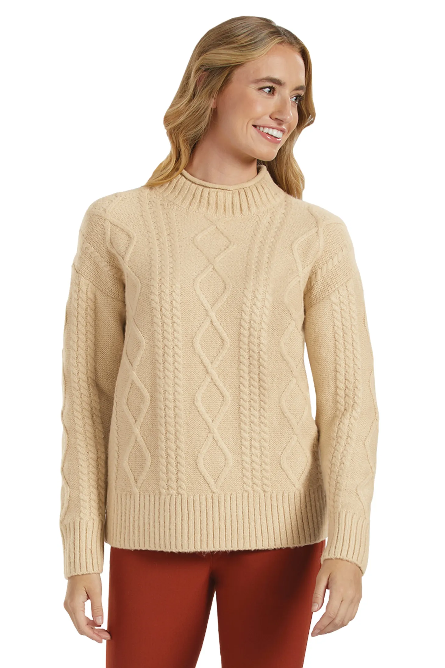 IconEQ™ Rowan Sweater carries traditional cable knit comfort and style into the saddle. Beautifully made for brisk days, it is knit from a fiber blend that provides four-way stretch for your freedom of movement. Rowan wicks moisture, provides breathability and dries fast to prevent the dampness that can cause chill. The hem can be worn long or above your hips to avoid interference with riding.