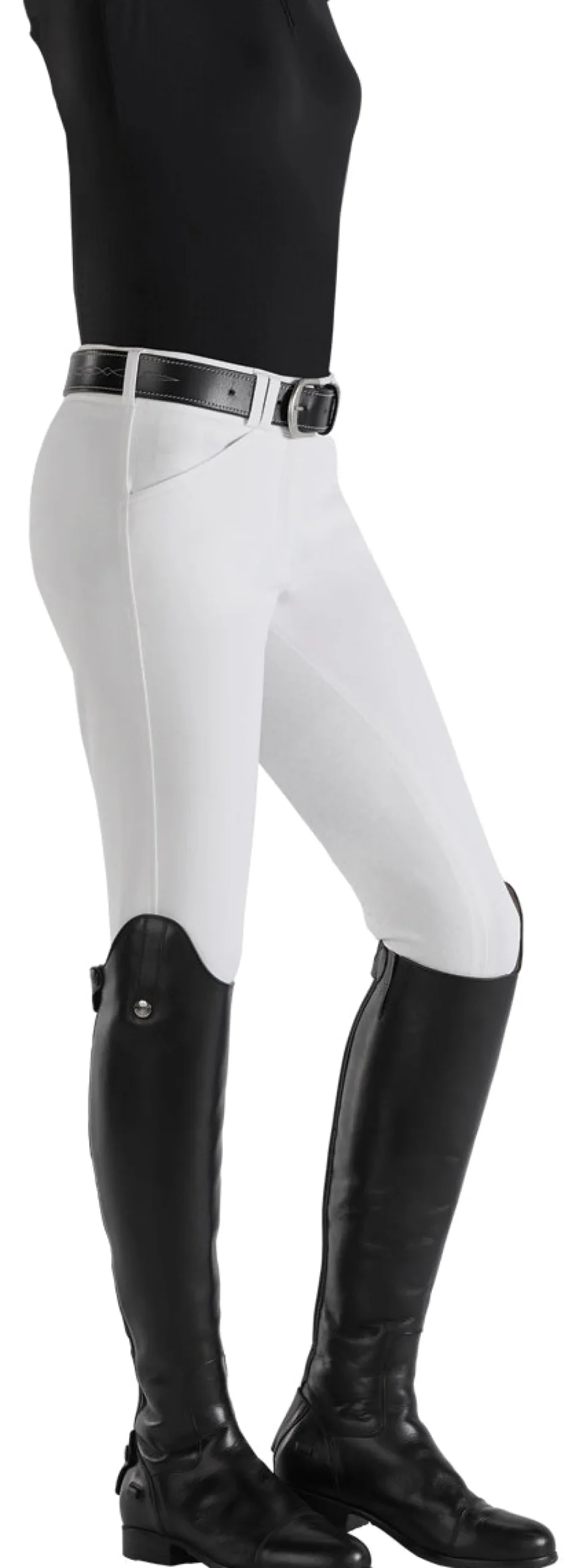 Wraparound sock bottoms are replaced with single-layer, high-stretch calf panels to provide a more custom fit and to eliminate bulk inside boots. Slash front pockets are made with low-profile stretch material for a no-show appearance on the outside and enhanced comfort on the inside. The silicone grip full seat boasts a stylish equestrian pattern and long-lasting grip.