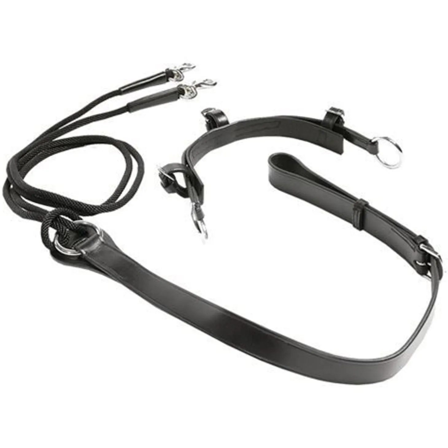 The Chambon by Kavalkade is a training aid used while lungeing that consists of a headpiece, chest piece and a round nylon rope with carabiner. An excellent training tool when used properly, the aim of the chambon is to teach the horse to yield to poll pressure and to stretch his neck forward and downward. It is particularly useful for ewe-necked horses and those that move with tense, hollowed backs. In the hands of a knowledgeable handler, the chambon helps the horse learn to use his body more efficiently, to strengthen and lift his back, and achieve the balance necessary for effectively carrying a rider and all gaits. Quality black leather with European styling.