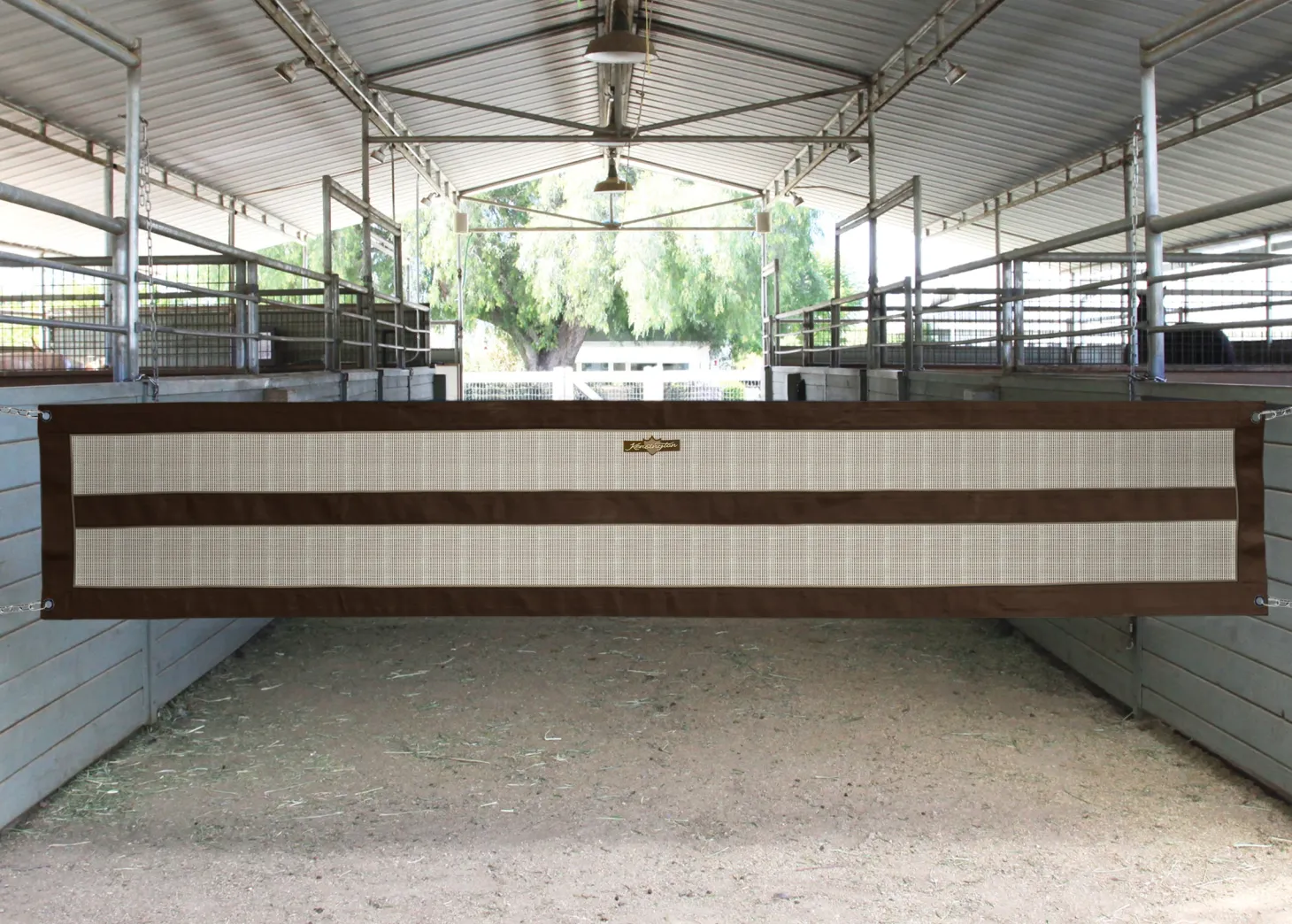 This practical and attractive Kensington™ Aisle Guard with Adjustable Sides lets air circulate while securing open aisle doorways during grooming, farrier visits and other occasions. It is made of durable, fade-resistant, Textilene® mesh and finished on all four sides with a coordinating, 3″ wide nylon web border.
