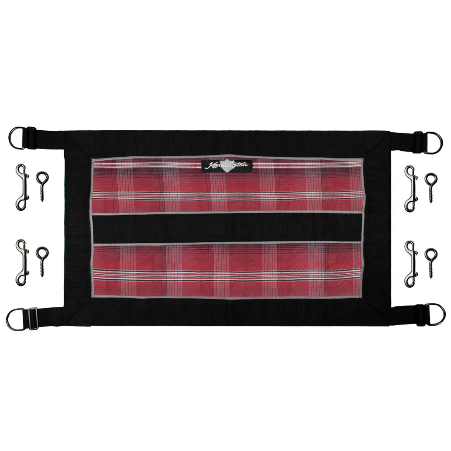 Kensington’s Stall Guard adds a touch of elegance to your stall door opening while it keeps your horse safely in the stall. Made of durable Textilene® mesh and bordered on all four sides with 3″ nylon webbing, the guard is adjustable to fit openings up to 47″ wide using the adjustment straps. Beautiful brass hardware completes the look and includes heavy-duty D-rings for easy fastening, double ended snaps and screw eyes for attaching to the barn door. The solid web center is ideal for personalization with a monogram.