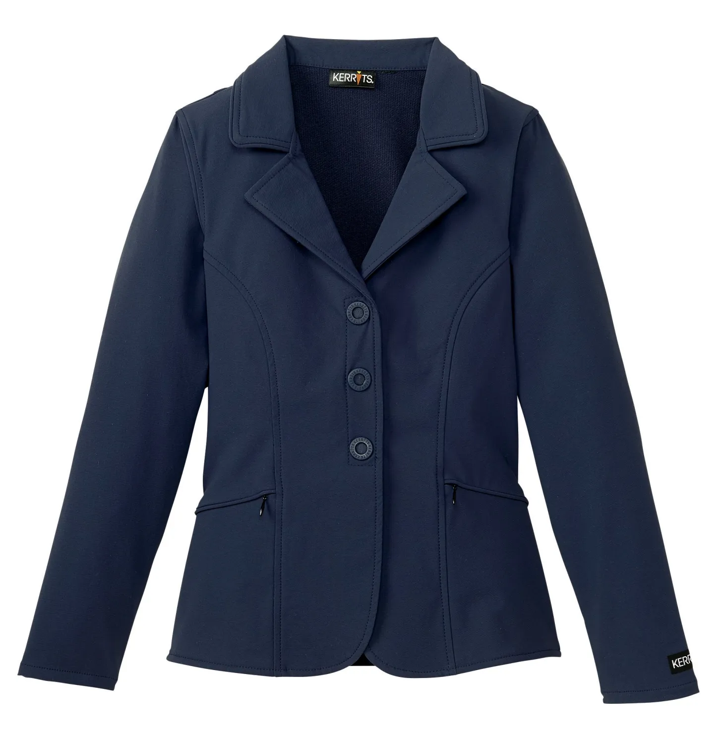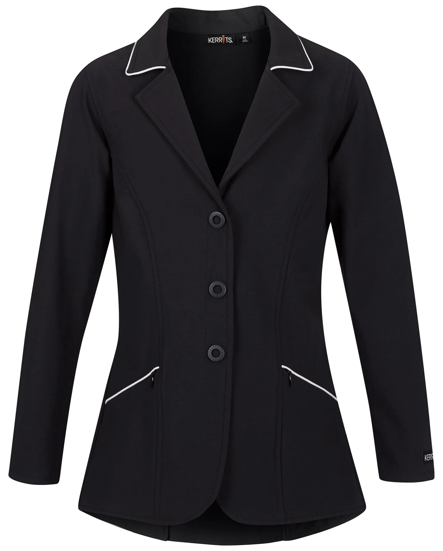 The Kerrits Kids’ Competitors Koat is thoughtfully designed as an affordable and versatile alternative to a traditional hunt coat. Based on the popular adult version but scaled down for children, this easy-care show coat features Kerrits’ washable, wrinkle-resistant Dynamic Extreme™ fabric. It offers the ultimate in four-way stretch for complete freedom of movement and an athletic cut that enhances the rider’s form. The classic three-button front has a hidden zippered placket for a smooth look with no gapping. The double-vented back completes the show-ring ready look.