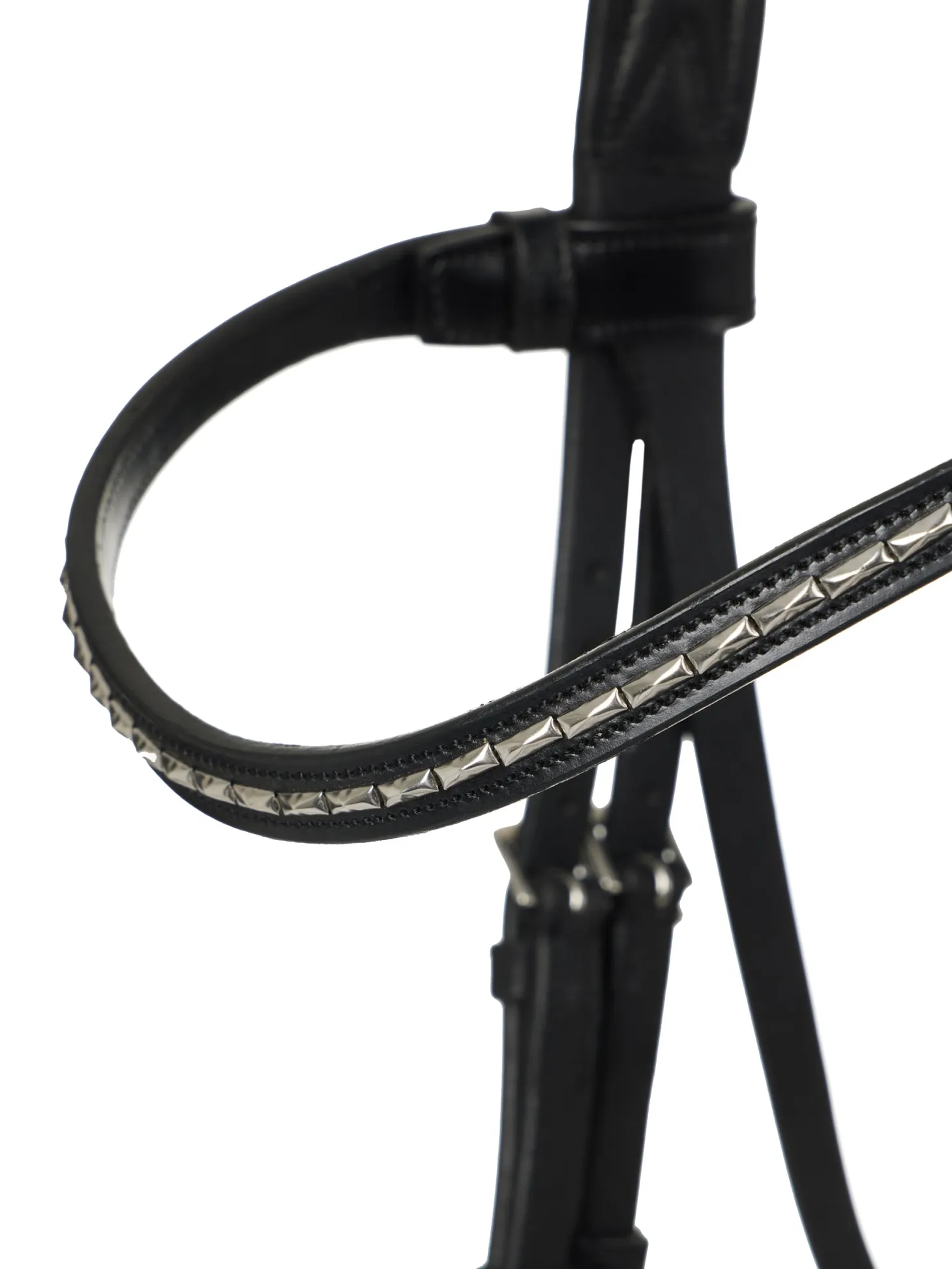 The delicate, beautifully sculpted clincher browband is easily detachable with popper closures. The statement crank noseband is fully cushioned and equipped with a roller buckle, as is the flash strap. Throatlatch secures discreetly with one buckle under the jaw.