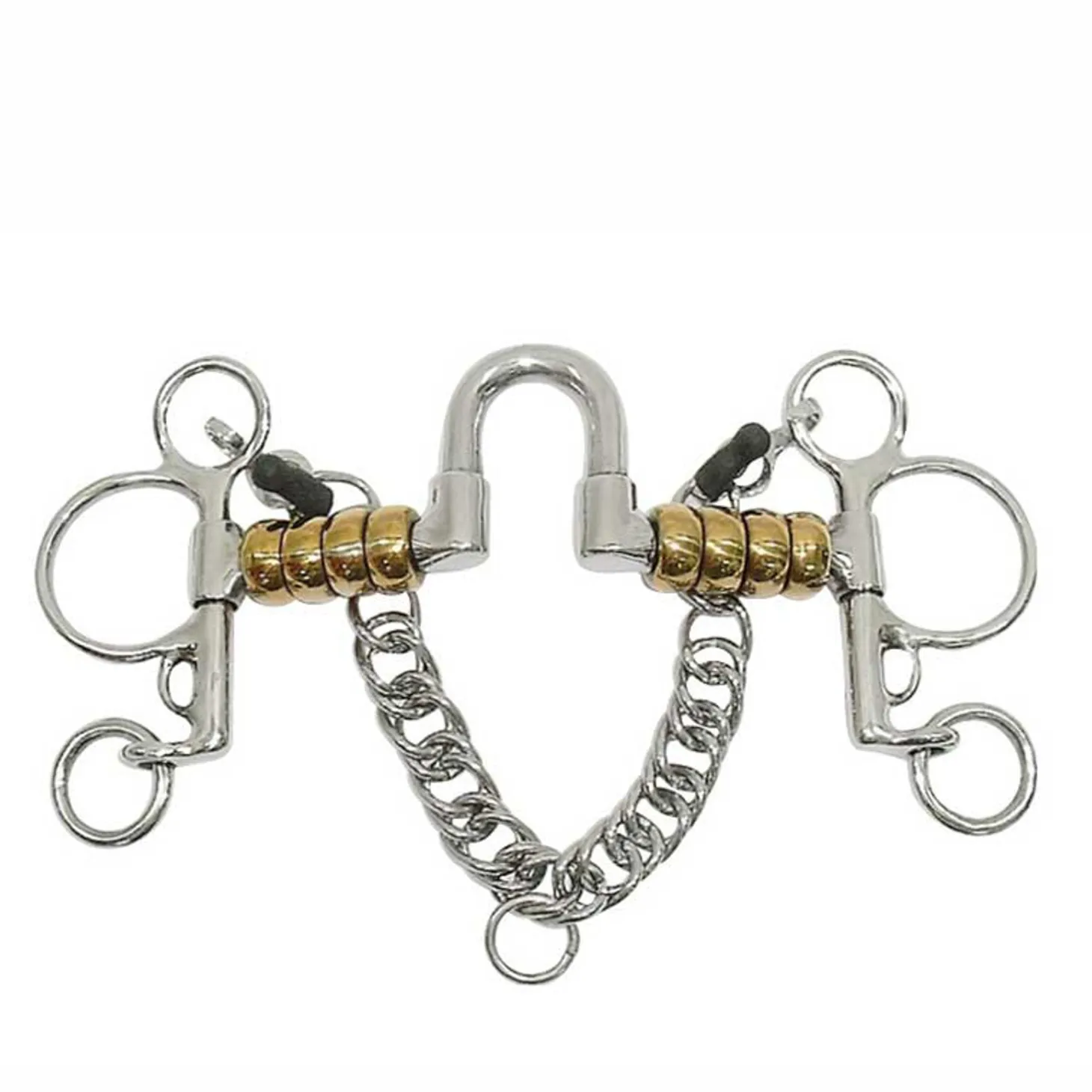 The Metalab Correction Pelham Bit is a Level 5 design in stainless steel. The 5 1/4″ mouthpiece has copper cherry rollers and a sliding high port. Pelham cheeks and curb chain.