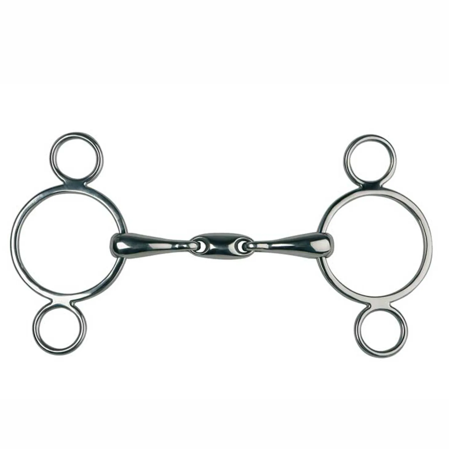 The Metalab Double Jointed Continental Gag is a Level 3 bit made of stainless steel. It features an 18mm double-jointed mouthpiece with oval center link and continental gag cheeks.