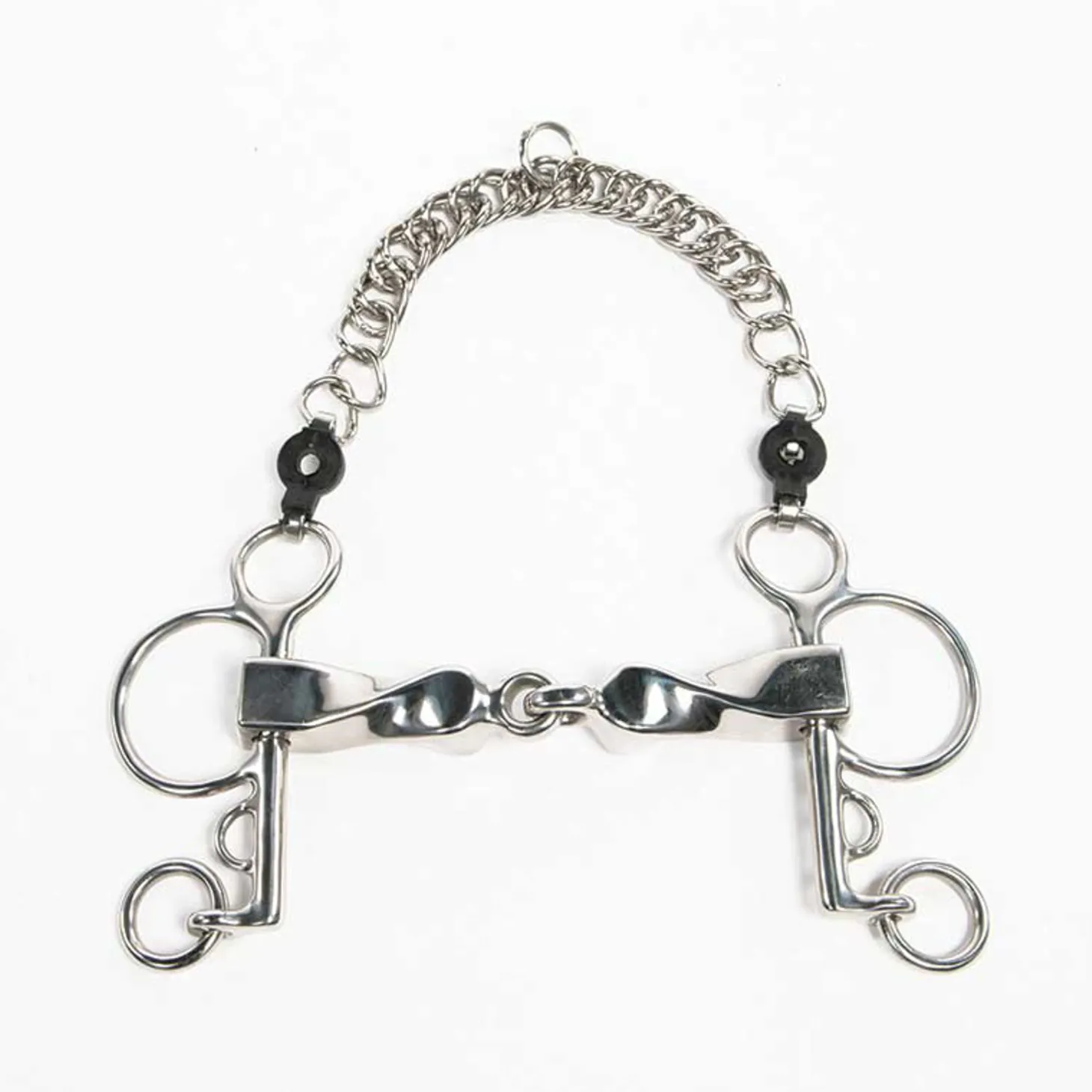 The Metalab Jointed Twisted Short Lever Pelham is a Level 4 bit. Made of stainless steel, it features a 5 1/4″ large, twisted mouth.