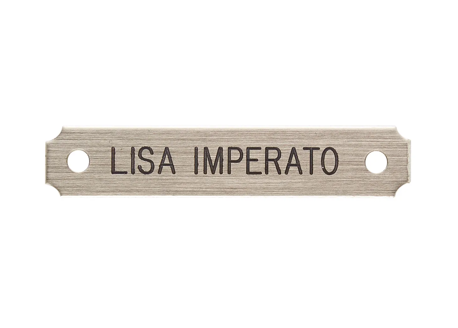Our Notched Corner German Silver Bridle Nameplate is a classic label for your horse’s bridle. The nameplate will be engraved in USA in your choice Block, Old English, Roman or Script letters with your horse’s name, your name or your farm’s name. Predrilled 5/32″ holes fit rivets for attachment. Two sizes of rivets are included to allow you to attach the nameplate to either a padded or flat leather bridle. Personalized items are not returnable.