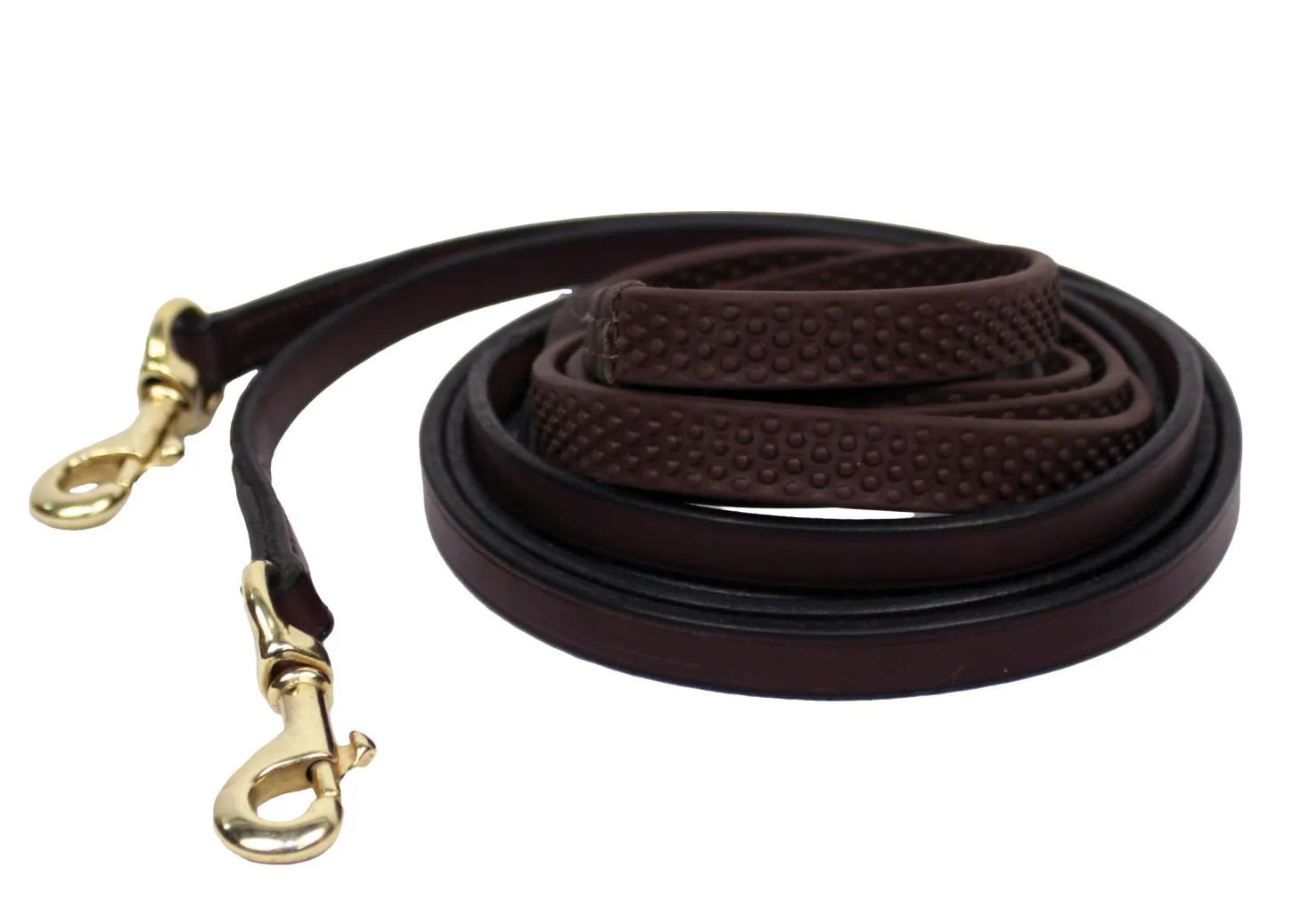 Nunn Finer® Soft Grip Draw Reins are designed with comfort and ease of use in mind. Premium leather portions move freely through bit rings, while the soft rubber grip enables the rider to maintain a supple hold. Solid brass snaps.