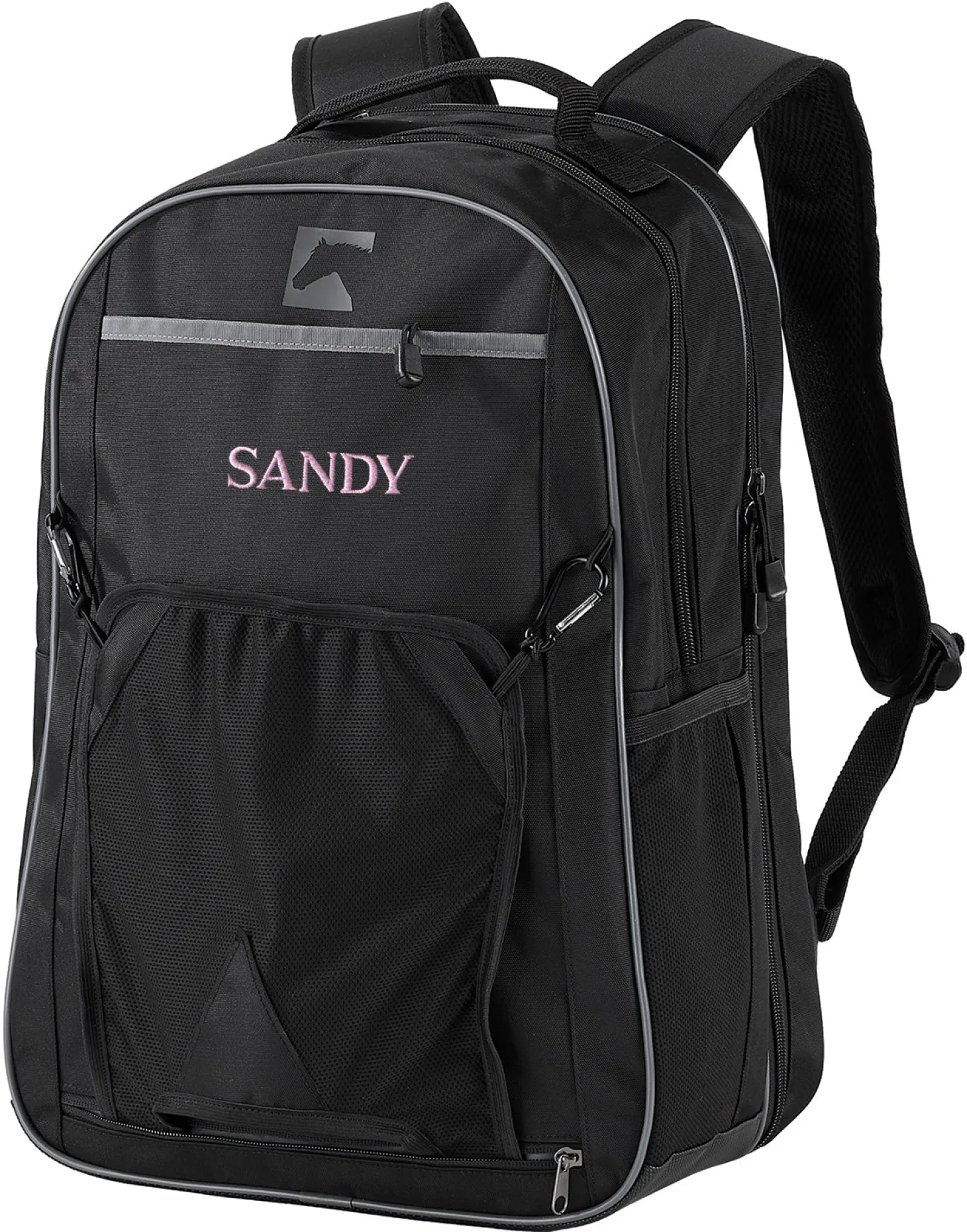 On-the-go and in-the-know, real riders designed this Riding Sport™ Backpack to hold all those items you take along for a day of riding. An outside front pocket stretches to store your helmet securely and can be stowed in a zip pocket in the bottom of the bag when it’s not needed. A full-size water bottle slips into a large mesh side pocket, and a side holder keeps a crop or whip handy.