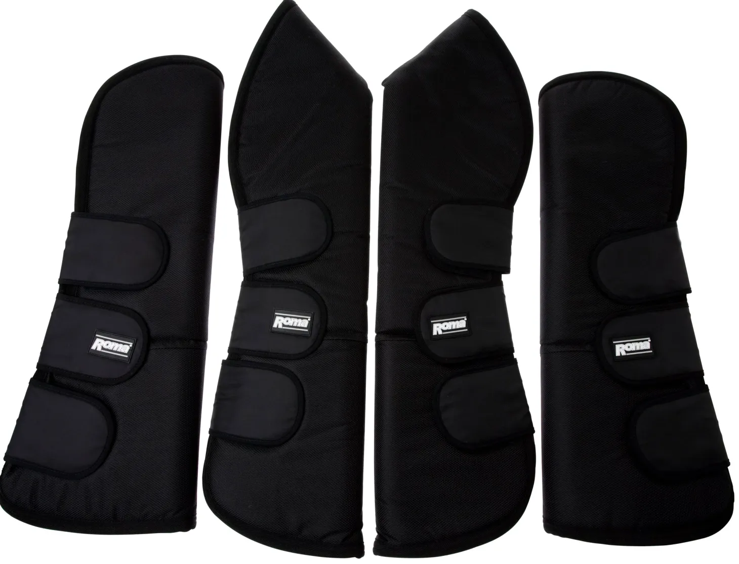 Roma® Deluxe Travel Boots pair a tough, 1000 denier outer shell and soft fleece lining. Coverage is complete with extended protection to knees and hocks. Wide Velcro® brand closures allow easy application. Each set of four boots is sized for an average horse.