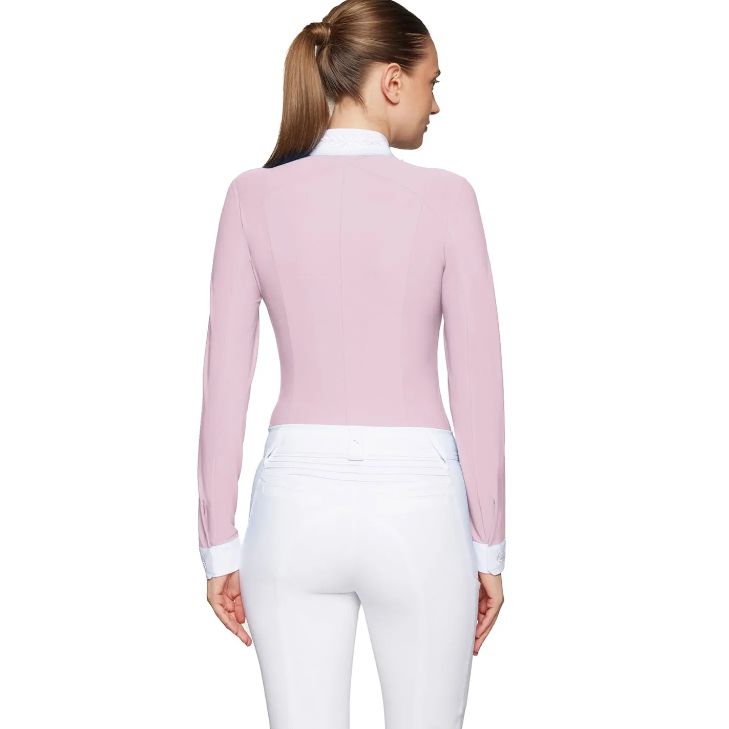 For riders looking for a timeless style, the Samshield® Aline Crystal Long-Sleeve Show Shirt is sure to deliver. A technical, competition style top with floral embroidery, crystal detailing and a premium finish. Two-tone design with half-zip styling and a stand-up collar with magnet closures. Samshield logo on the collar and cuffs with crystal detailing. Floral embroidery with Swarovski® crystals and magnet closures on the ends of the sleeves. Breathable and stretchy fabric is designed in an eco-responsible way to last over time with anti-pilling, wrinkle-resistant finish. UPF 50 sun protection.