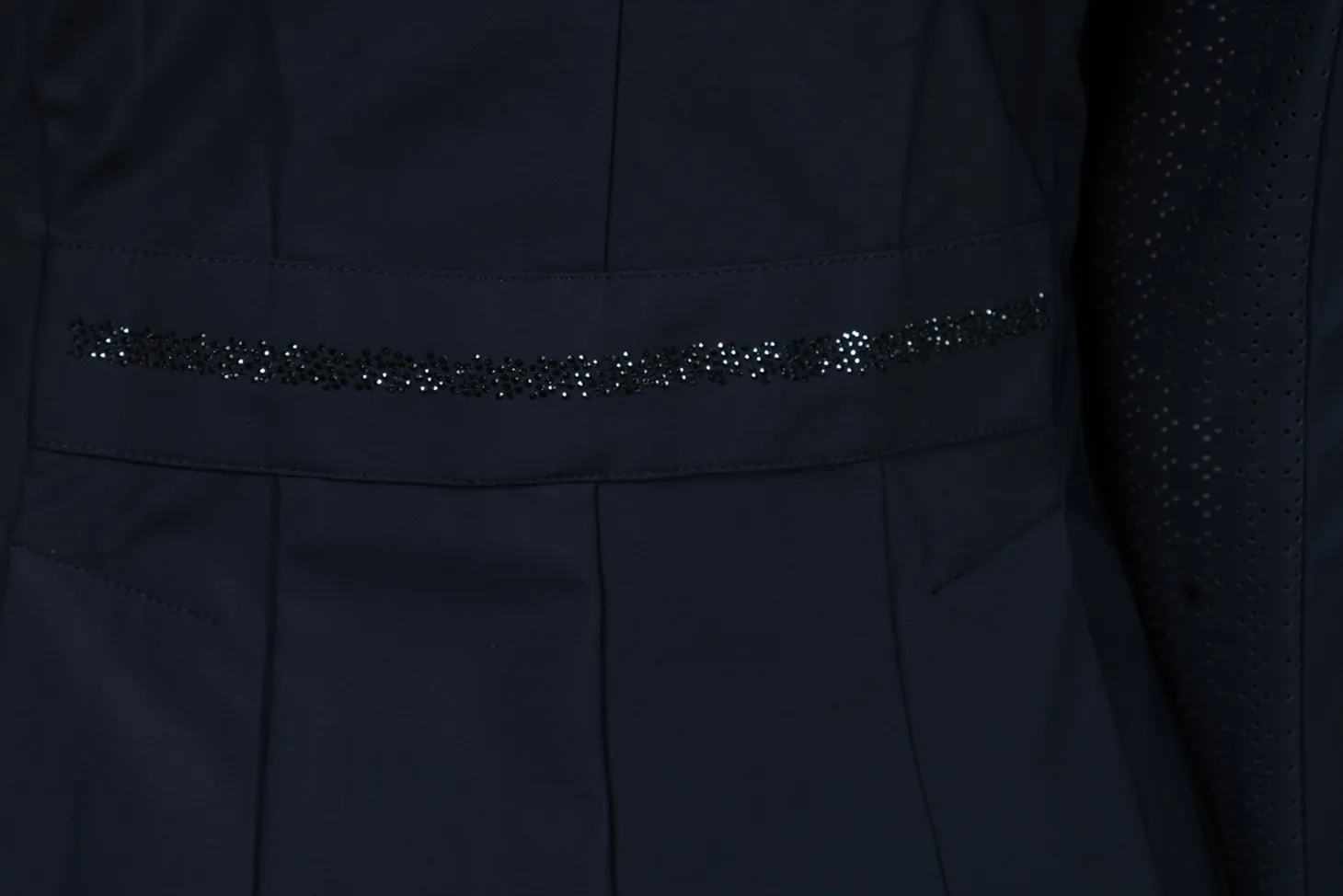Fashionable, functional and ready to perform, the competition jacket has been elevated with the Schockemöhle Ladies’ SpAlaine Show Coat. Piped pockets with flaps and rhinestone decoration for a flattering look in the saddle, perforated side panels with dividing seams and back bar at the back. Walking slits, rhinestone decoration on the collar and back bar. Buttons and a concealed zipper close the jacket with a clean silhouette. Logo rubber badge on the sleeve announces Schockemöhle sophistication.