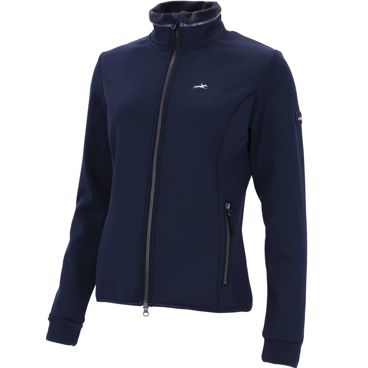 Look sporty and chic in the Schockemöhle SpReny Full Zip with elegant details! Flattering seams create a feminine fit, while the stand-up collar adds a modern, athletic look. Perforated inserts at the front, back, and sides provide excellent ventilation. 2-way zipper and two zippered pockets. The elastic trim at the hem and cuffs ensures a comfortable fit. Rhinestone logo design on the back, complemented by the embroidered horse logo on the chest and the left sleeve.