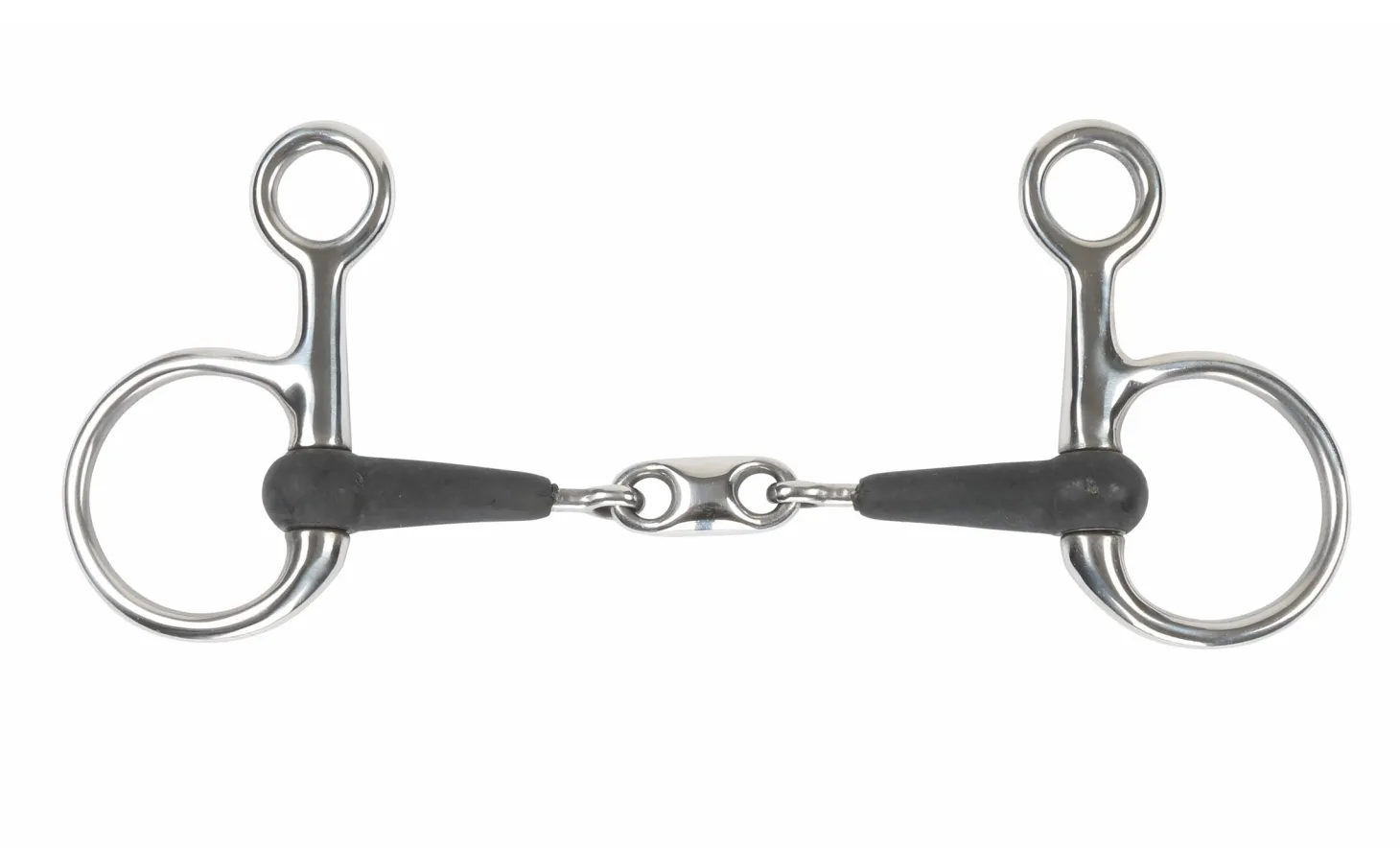 The Equikind+ Hanging Cheek Peanut Link Bit from Shires exerts a little poll pressure to encourage flexion. The peanut link in the mouthpiece distributes pressure over both the tongue and bars of the mouth to encourage mouthing and contact. A thin coating of rubber makes this bit milder than a traditional metal bit as it softer on the bars and lips. Mouthpiece is 14mm; rings are 110mm.