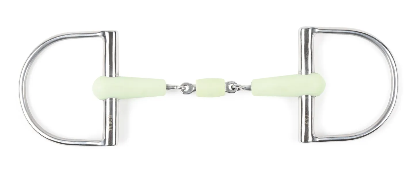 Shires Equikind Peanut Hunter D-Ring Bit has a 14mm mouthpiece with an apple-flavored covering to promote bit acceptance. The three-piece mouth with center peanut allows the bit to rest lie nicely on the tongue, offering gentle tongue pressure but avoiding the palate. The classic d-rings promote sideways stability in the mouth. Rings are 90mm.