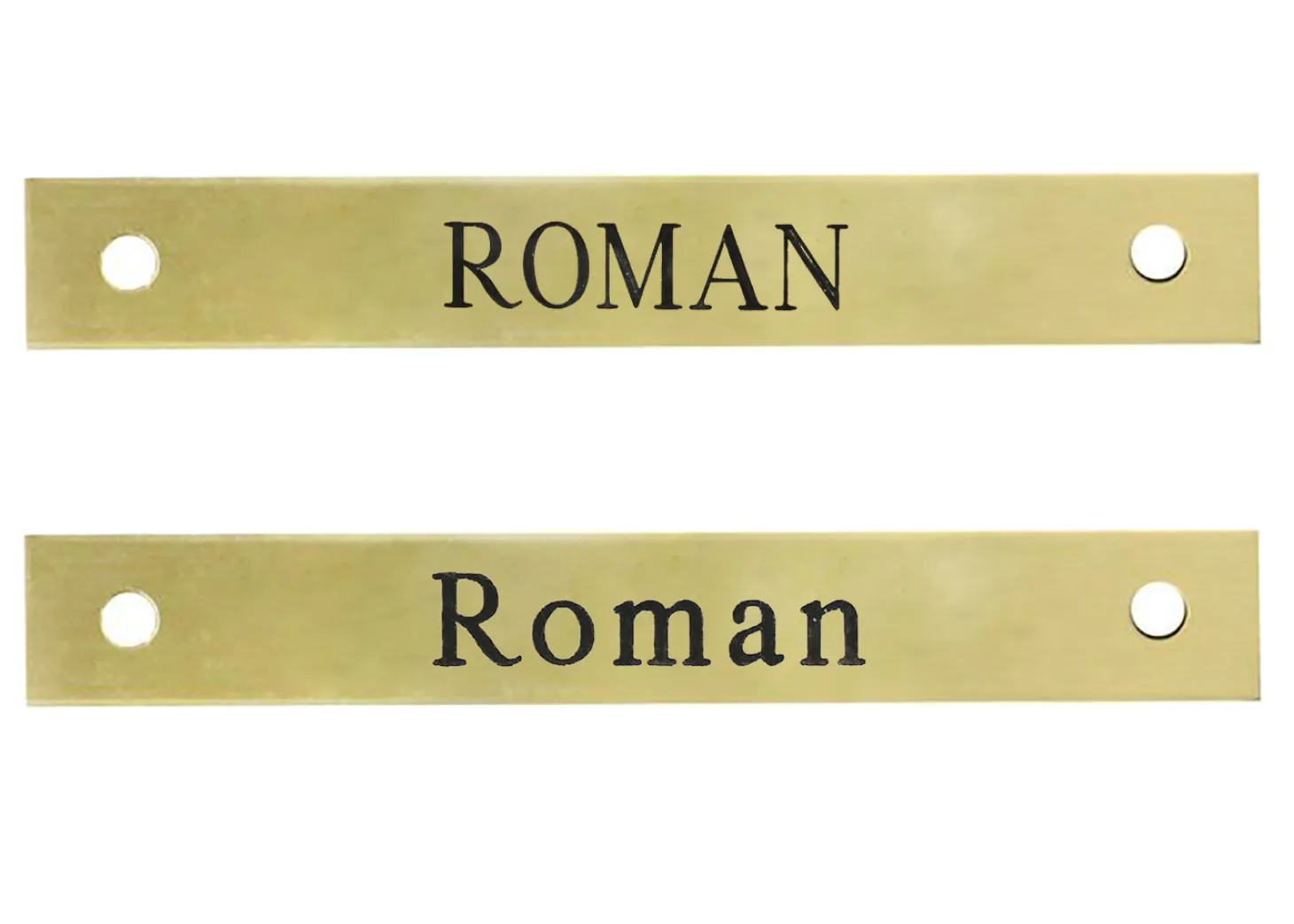 The Small Rectangular Halter Nameplate is both a classic and elegant way to identify your horse’s leather halter—and it is an ideal size for pony halters. Your plate will be engraved for you in the USA. Choose Block, Old English, Roman or Script letters, then enter the words you would like engraved. Predrilled 5/32″ holes fit rivets (included) for attaching. Personalized items are not returnable.