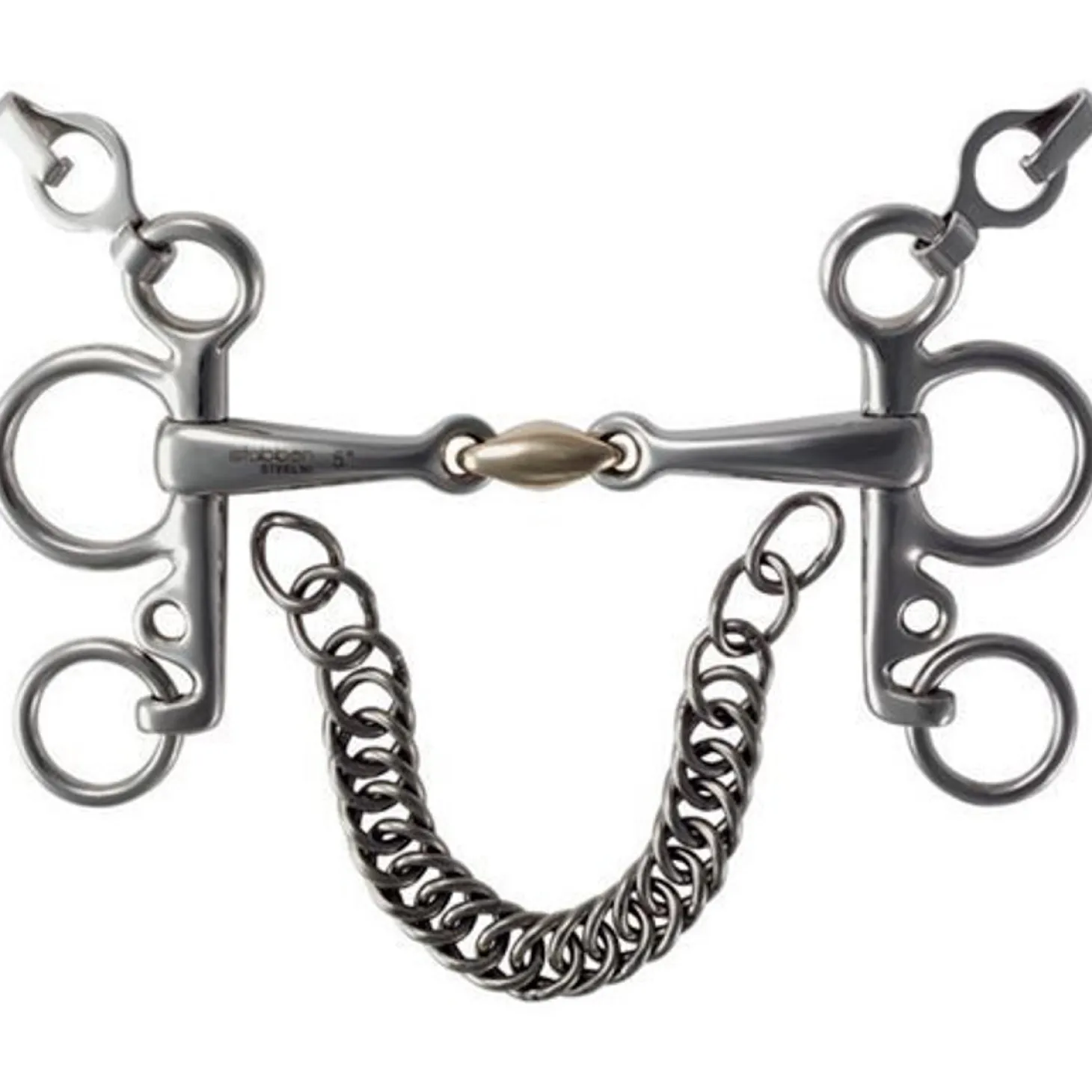 Stübben Sweet Copper Pelham Bit is a top quality bit made with STEELtec and only smooth connecting pieces that have no sharp edges. The link mouthpiece eliminates the nutcracker action of the traditional snaffle while sweet copper alloy activates salivation and increases bit acceptance. 14mm mouth. 5 cm cheeks.