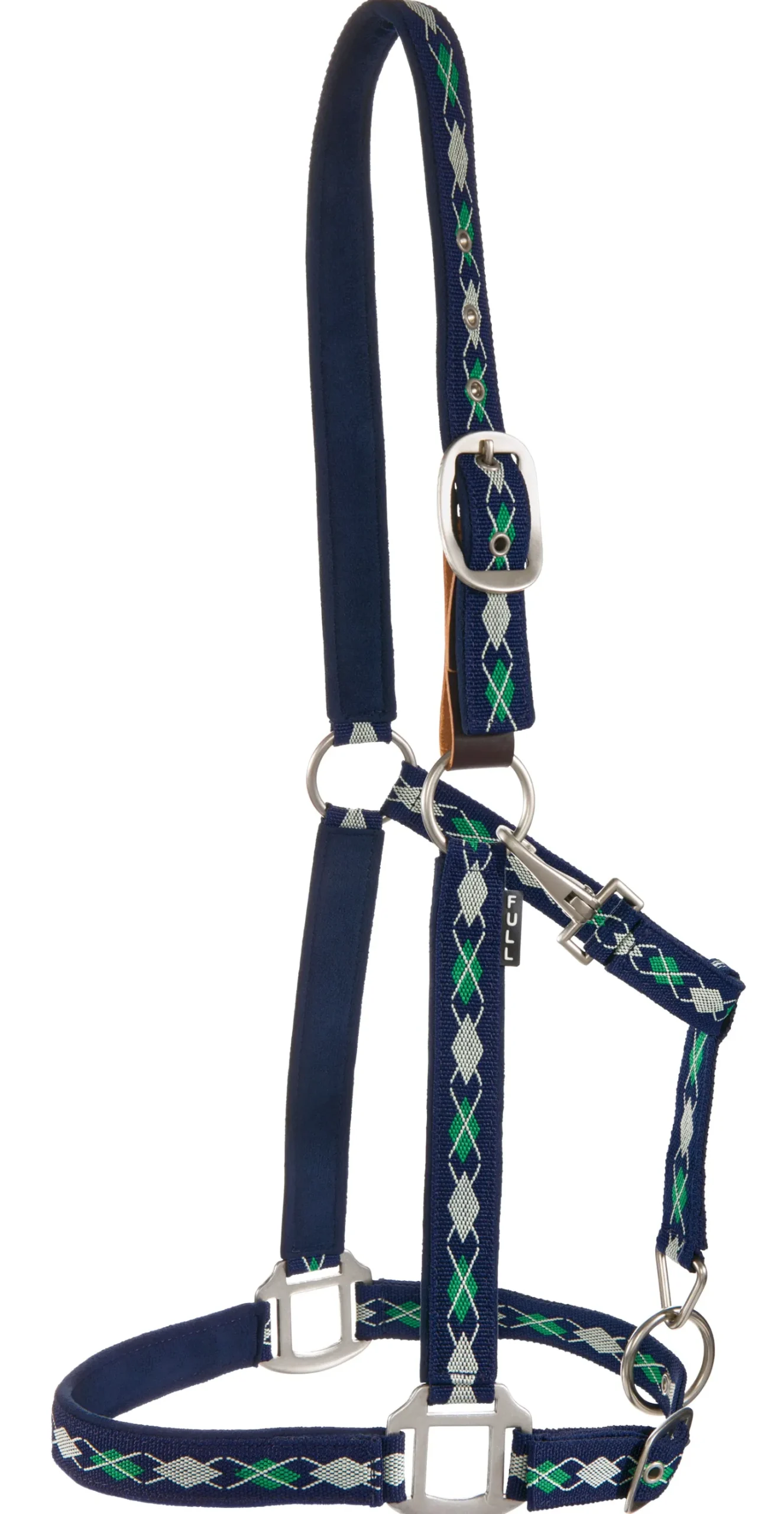 Our Suffolk® by Dover Saddlery® Woven Argyle Breakaway Halter has an easily replaceable leather fuse. For a stylish look with durability, a classic argyle pattern is woven into the 1″ wide nylon webbing. Fleece lines the crown, nose and cheeks.