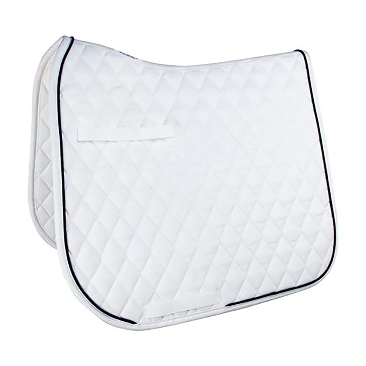 The resilient poly/cotton quilted top is embellished with piping, and a 100% brushed cotton lining offers a comfortable, nonslip surface against the horse. Contoured at the withers for a better fit, this dressage pad maintains a comfortable contact with the horse and does not bunch up under the saddle.