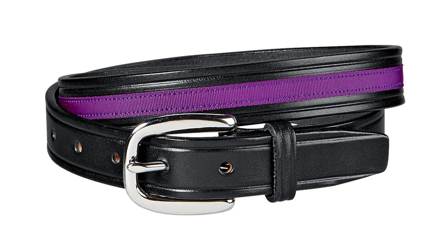 Add equestrian style and a pop of extra color with this Tory Leather Ribbon & Snaffle Bits Belt! Made in the USA from fine 1″ wide bridle leather, it has creased edges, two snaffle bits and a center overlaid with simulated ribbon. Sewn-on buckle.