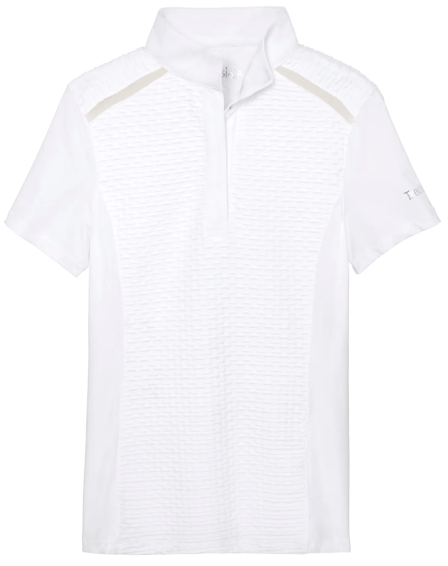 The Tredstep™ Solo Pearl Show Shirt adds contemporary twists to classic show styling with textural front, back and shoulder panels and mesh inserts along raglan shoulder “seams.” Lightweight stretch panels at the sides and sleeves ensure your freedom of movement. A ventilation grommet at the nape lets heat escape. Stand collar and covered placket for a polished presentation.