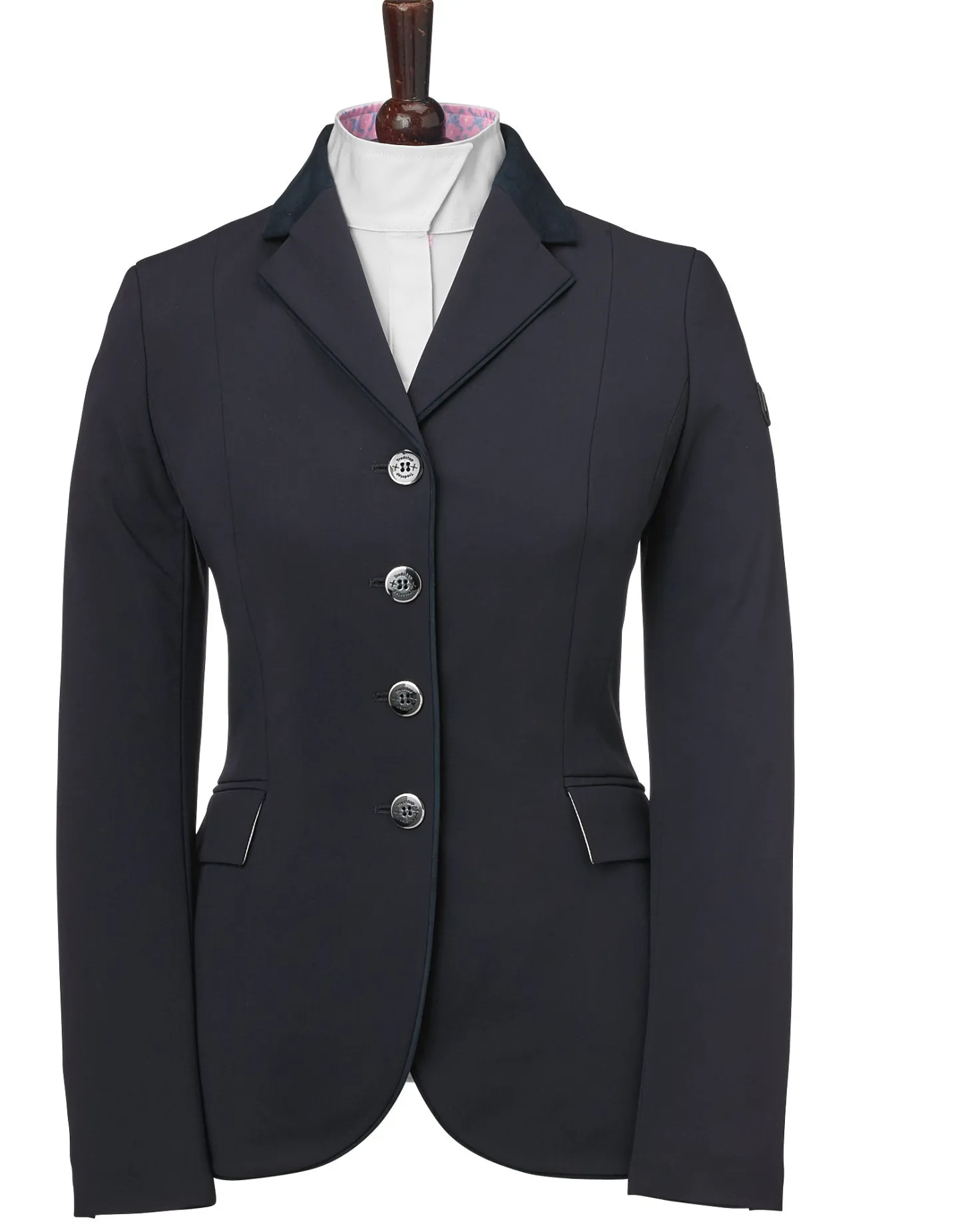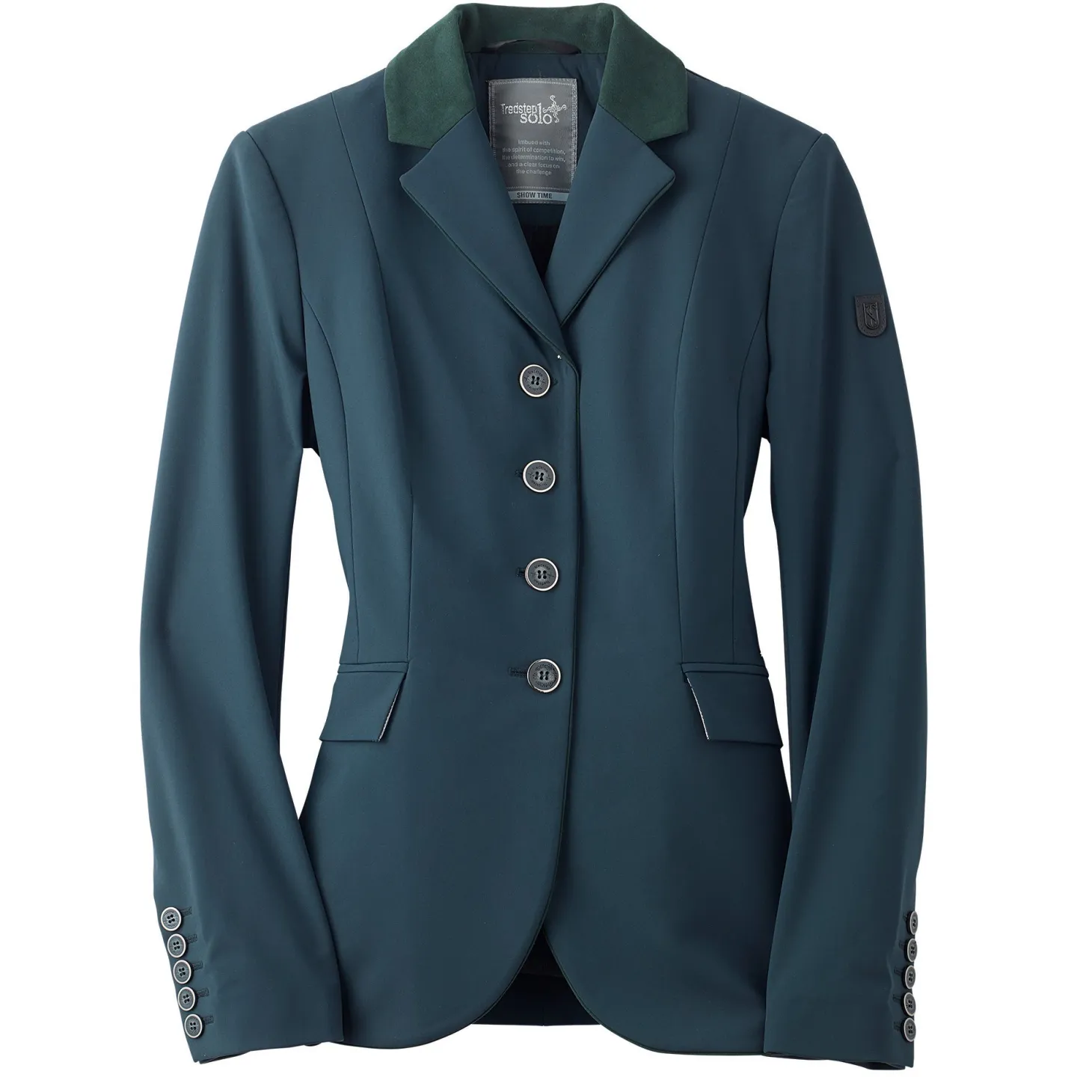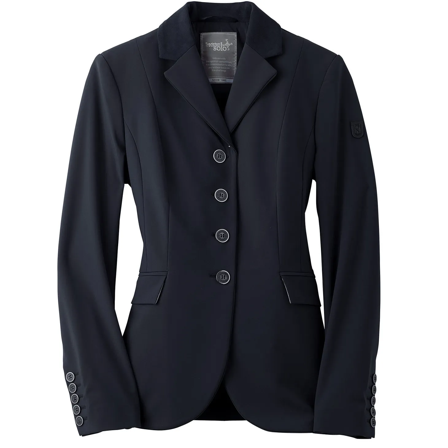 Impeccable Italian craftsmanship is reflected in every detail of the premium quality Tredstep™ Solo Showtime Show Coat. Exclusive technical fabric, developed in Italy, provides superior performance invisibly, with none of the traits that can compromise fine tailoring or a polished show ring appearance. The easy-care fabric has a dense finish for a soft hand and “noiseless” smooth movement. It provides exceptional stretch and recovery to let you enjoy 360° of flexibility, and provides water repellency, dust and stain protection, high abrasion tolerance and an anti-pill finish. Paired with a moisture-wicking, lightweight mesh lining, this highly breathable show jacket helps keep you cool. Painstaking design elements, such as figure-sculpting seams and articulated sleeves, create a gracefully refined silhouette. Subtle details let it transition to all rings and include tonal suede collars, center front piping and contrast trims on vents and pockets.